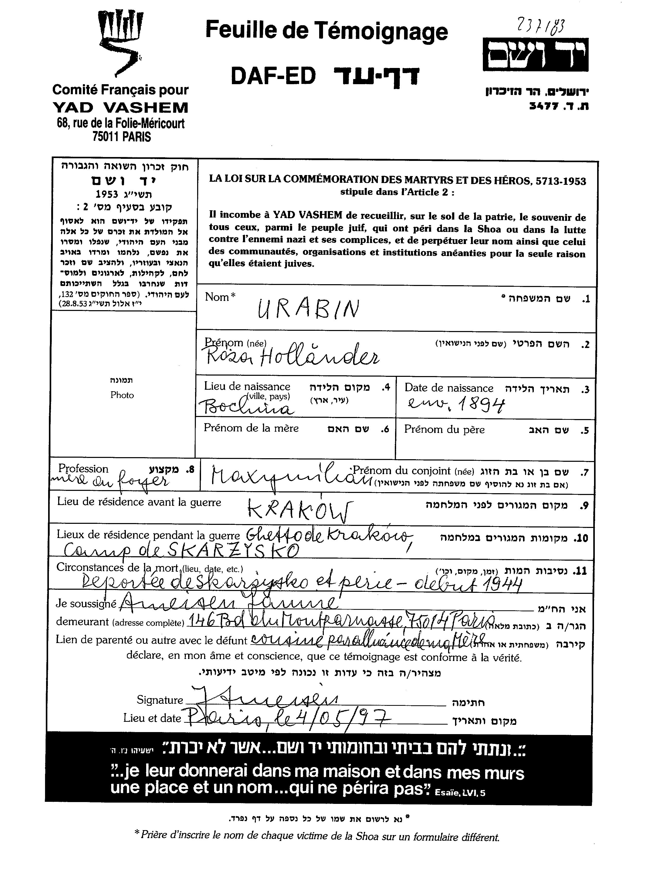 רוזה אורבין לבית Hollaender נולדה בBochnia שבפולין בשנת 1894. היא היתה עקרת בית ונשואה לMaxymilian. לפני מלחמת העולם השניה התגוררה בKrakow שבפולין. בזמן המלחמה היא היתה בKrakow שבפולין.