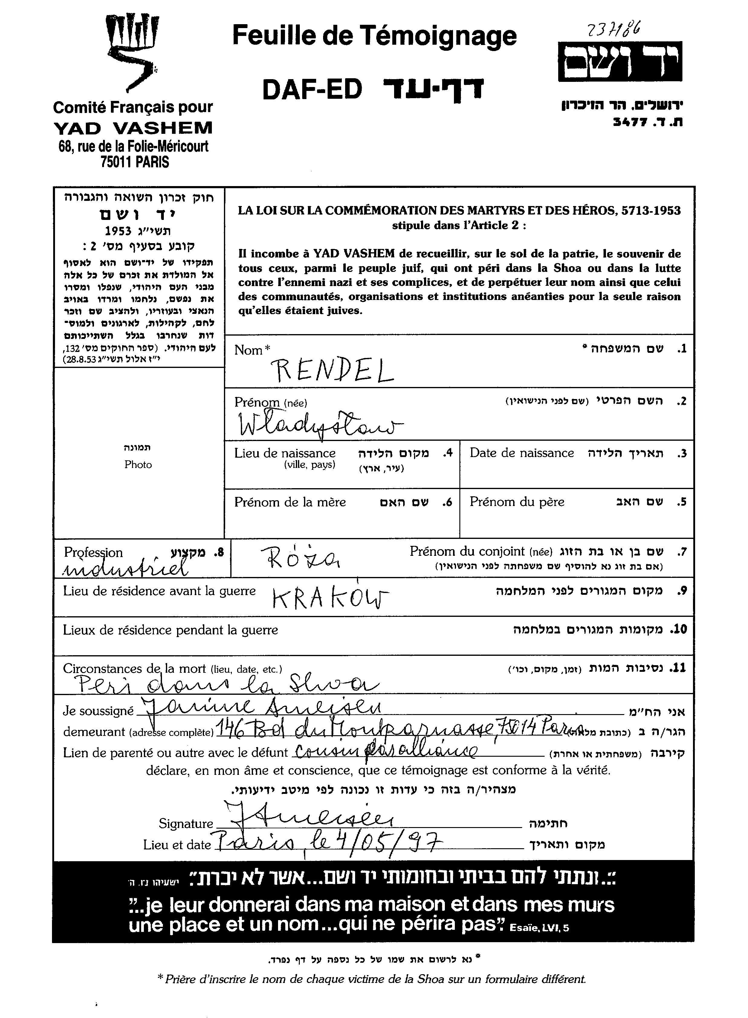 Wladyslaw רנדל. הוא היה תעשיין ונשוי לרוזה. לפני מלחמת העולם השניה התגורר בKrakow שבפולין.