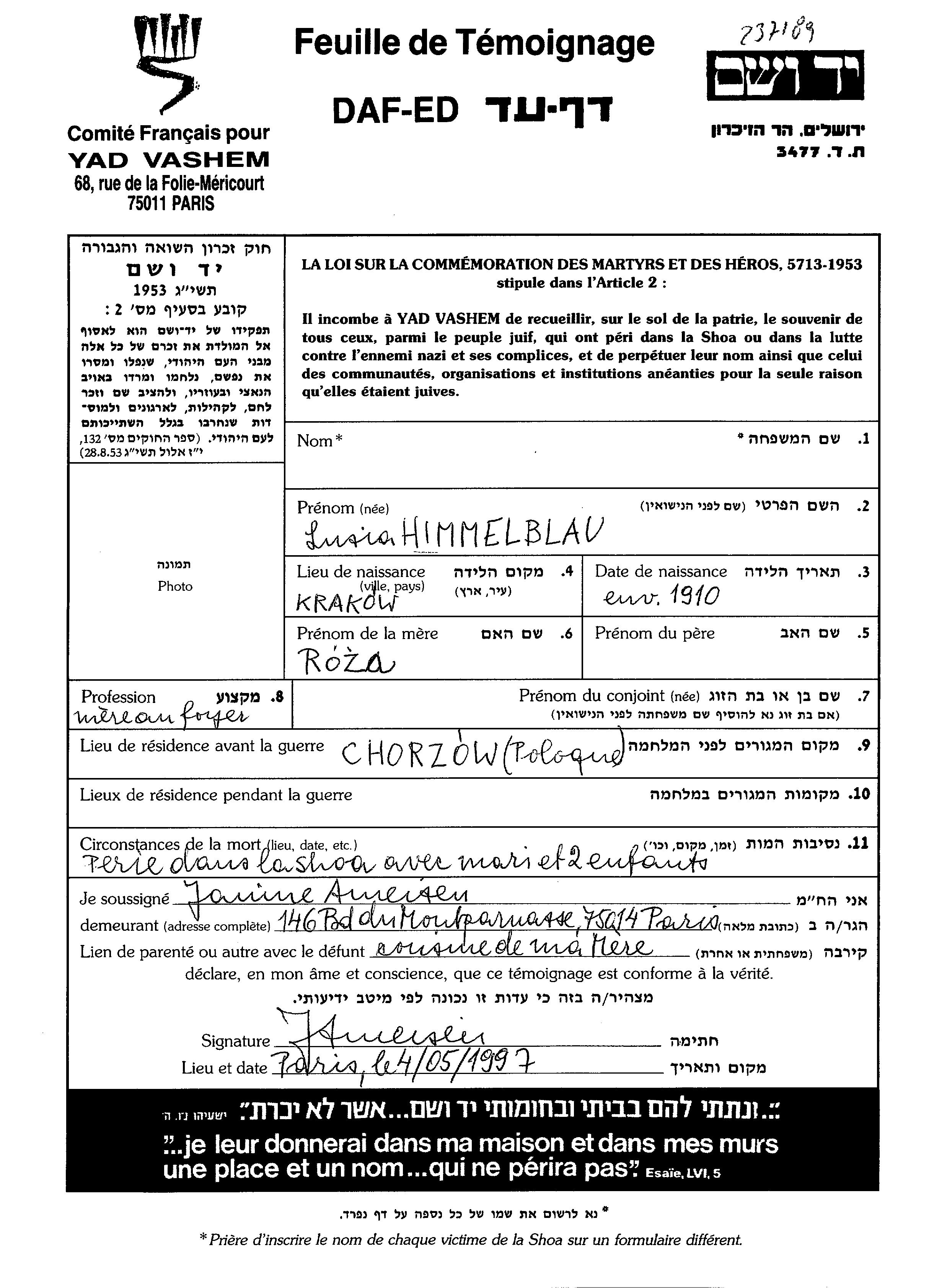 Lusia לוסיה שם משפחה לא ידוע לבית Himmelblau נולדה בKrakow שבפולין בשנת 1910 לרוזה. היא היתה עקרת בית ונשואה. לפני מלחמת העולם השניה התגוררה בChorzów שבפולין. היא נרצחה בשואה.