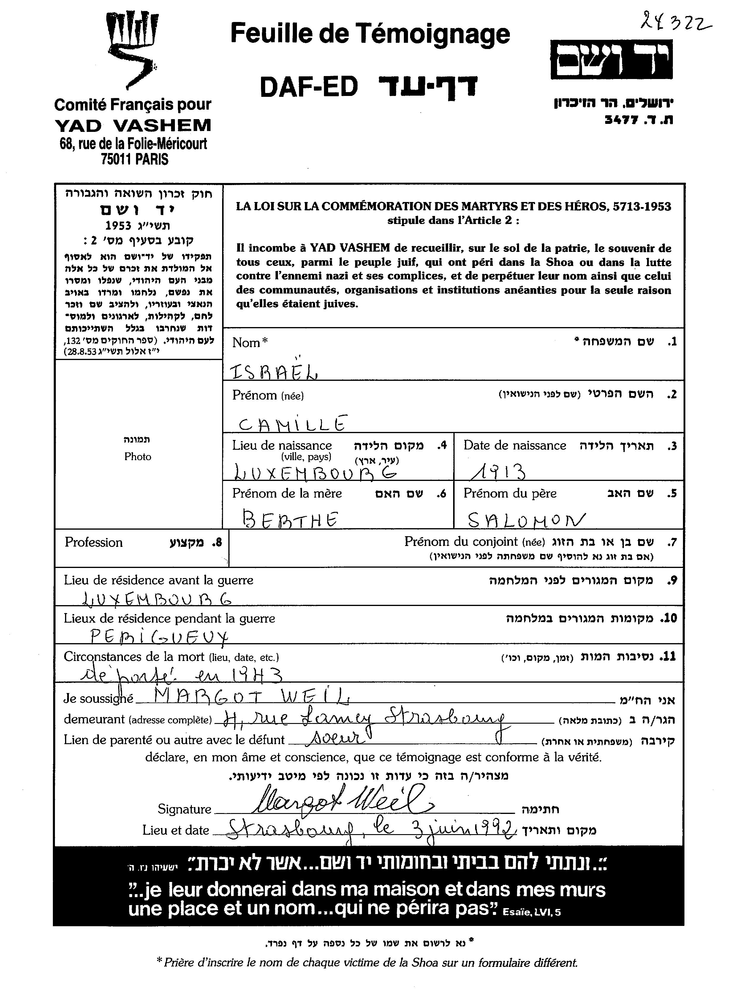 Camille ישראל נולדה ב<> (Luxembourg), בלגיה שבבלגיה בשנת 1913 לSalomon וBerthe ברט לבית Schwartz. לפני מלחמת העולם השניה התגוררה ב<> (Luxembourg), בלגיה שבבלגיה. בזמן המלחמה היא היתה בPérigueux שבצרפת.