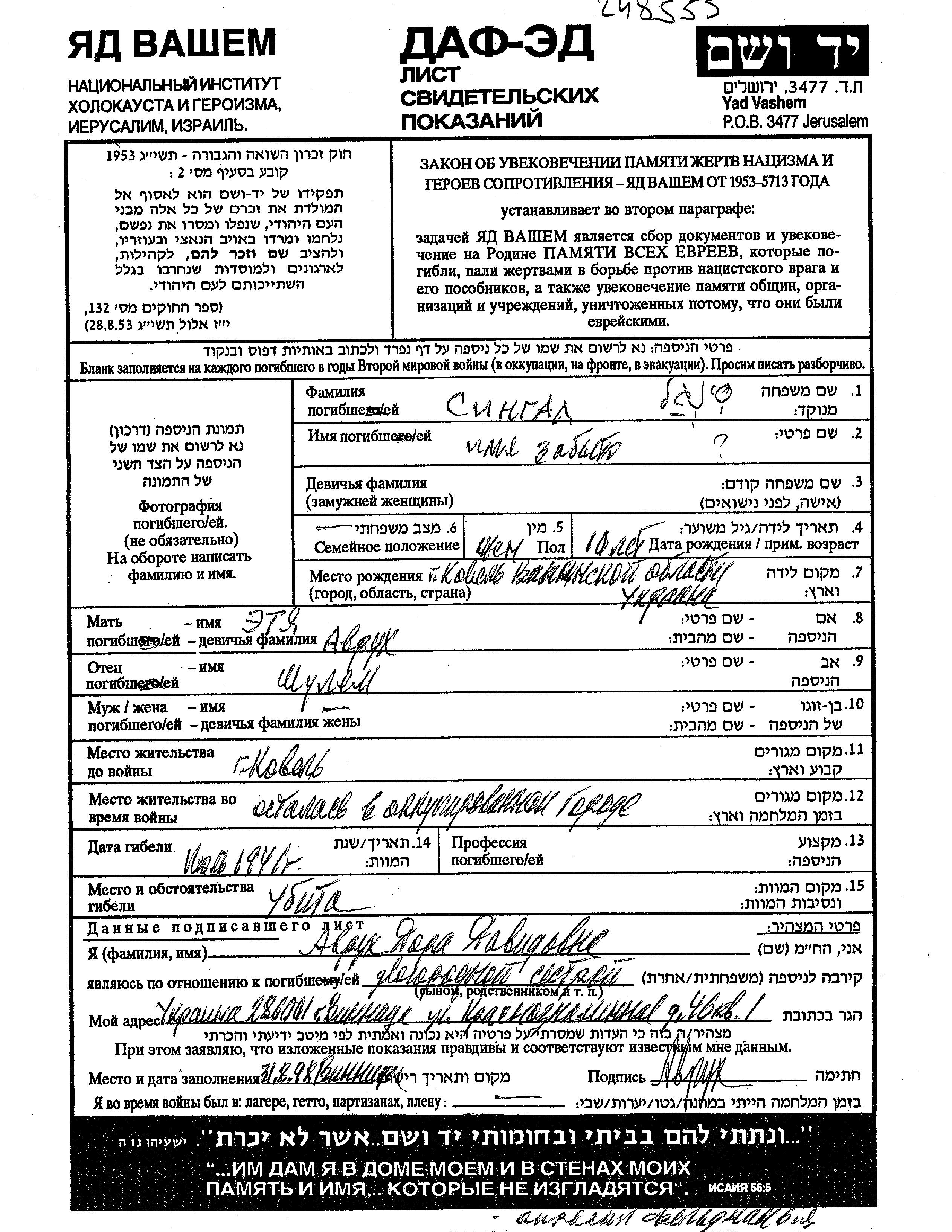 שם פרטי לא ידוע סינגל נולדה בKowel שבפולין בשנת 1931 לShulem וEtya לבית אוורוך. היא היתה ילדה. לפני מלחמת העולם השניה התגוררה בKowel שבפולין. בזמן המלחמה היא היתה בKowel שבפולין.