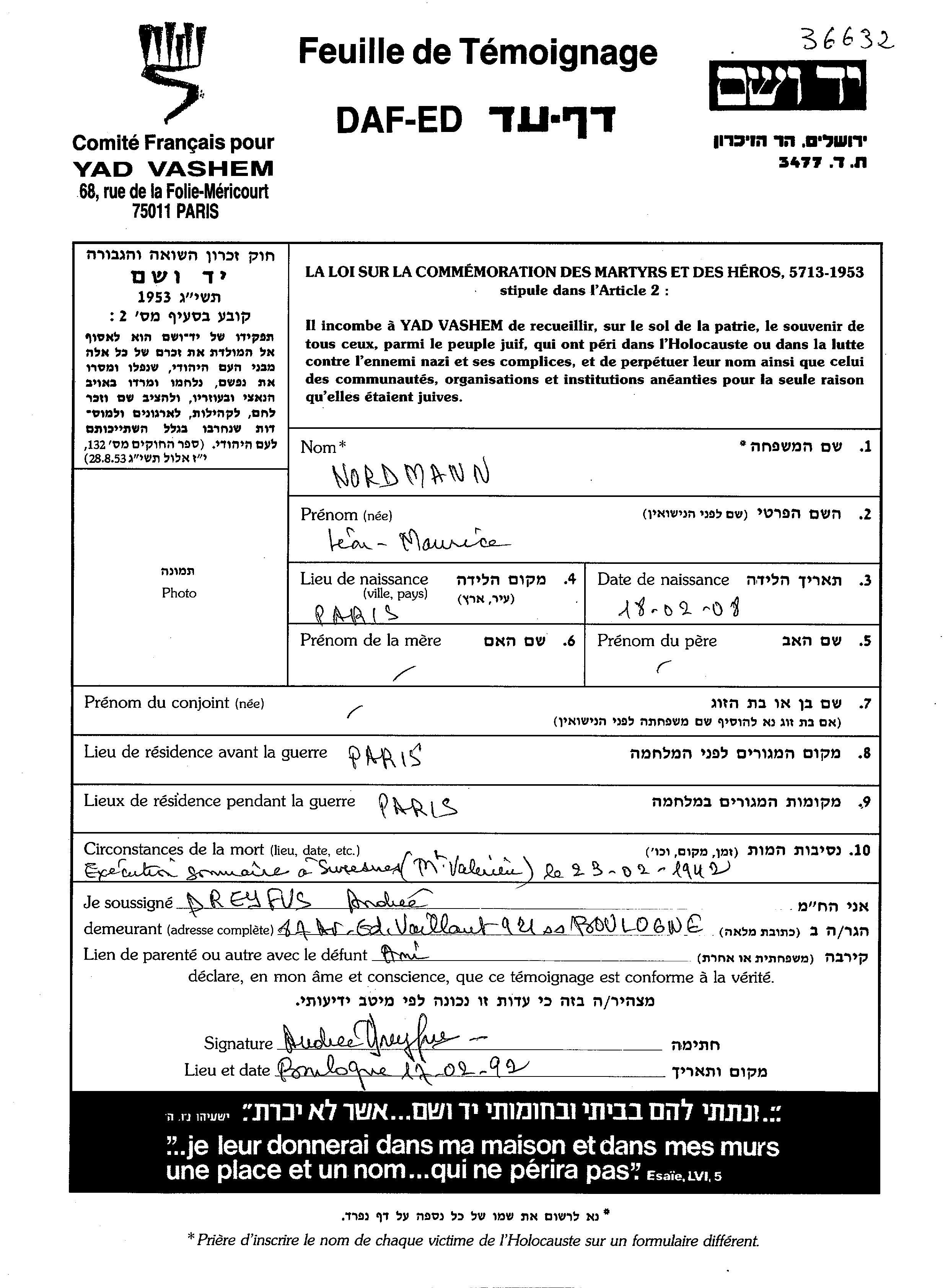 Maurice לאון Nordmann נולד בParis שבצרפת בשנת 1908. לפני מלחמת העולם השניה התגורר בParis שבצרפת. בזמן המלחמה הוא היה בParis שבצרפת. הוא נרצח בשואה. מקום המוות: צרפת שבצרפת בשנת 23/02/1942.