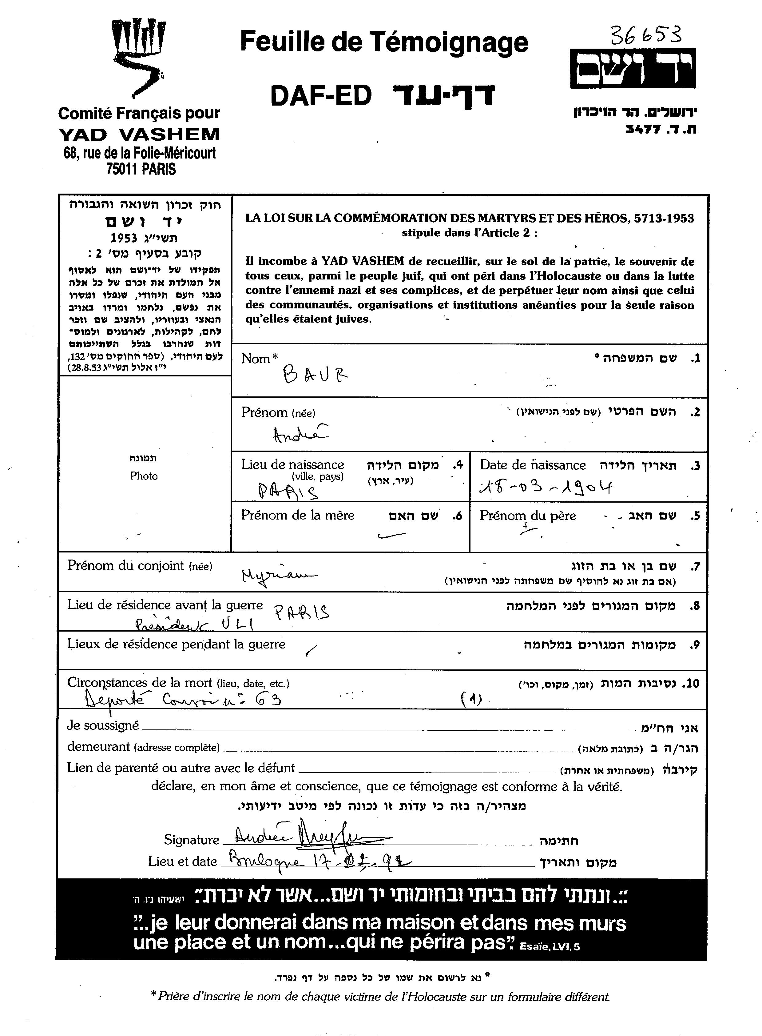 Andre אנדרה Baur בור נולד בParis שבצרפת בשנת 1904. הוא היה נשוי לMyriam. לפני מלחמת העולם השניה התגורר בParis שבצרפת. בזמן המלחמה הוא היה בParis שבצרפת.