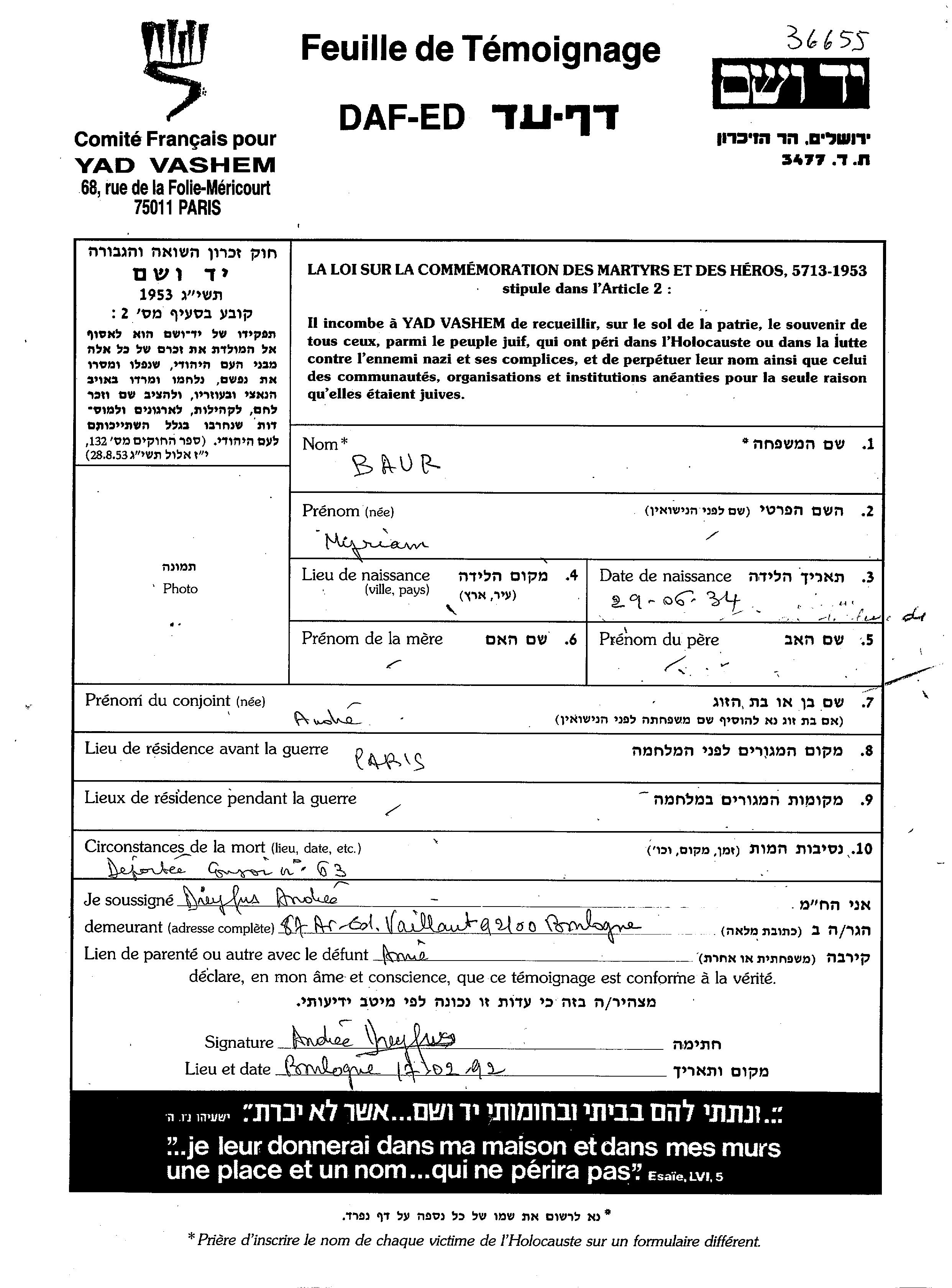 Myriam Baur נולדה בשנת 1904. היא היתה נשואה לAndre אנדרה. לפני מלחמת העולם השניה התגוררה בParis שבצרפת. בזמן המלחמה היא היתה בParis שבצרפת.