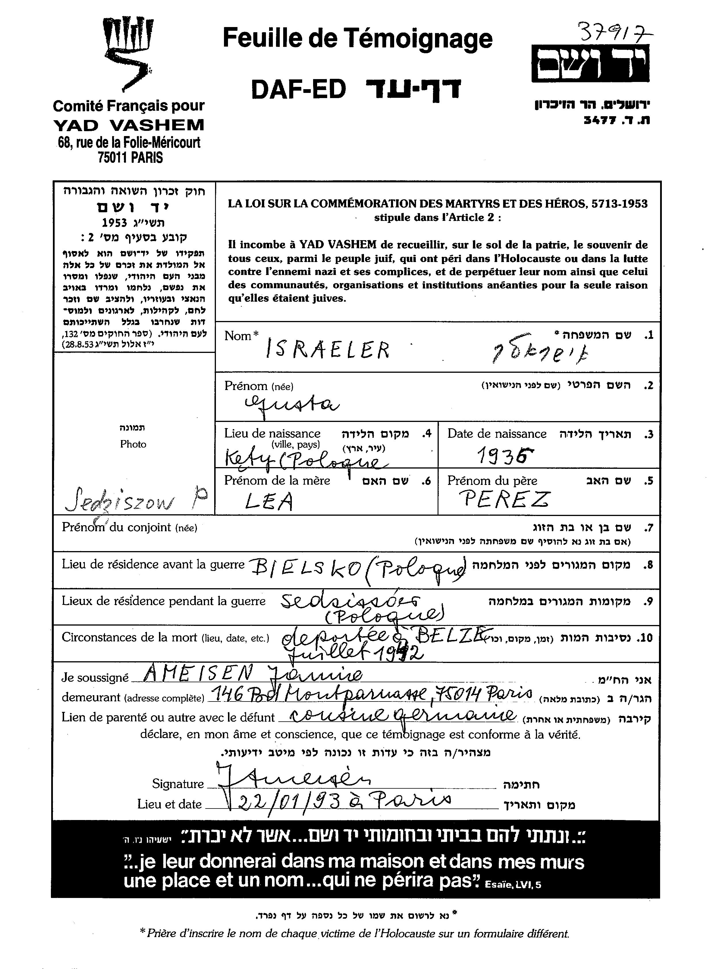 Gusta ישראלר נולדה בKety שבפולין בשנת 1936 לPerez ולאה לבית Weinberg. היא היתה ילדה. לפני מלחמת העולם השניה התגוררה בBielsko שבפולין. בזמן המלחמה היא היתה בSedziszow שבפולין. היא נרצחה בשואה. מקום המוות: Belzec שבפולין.