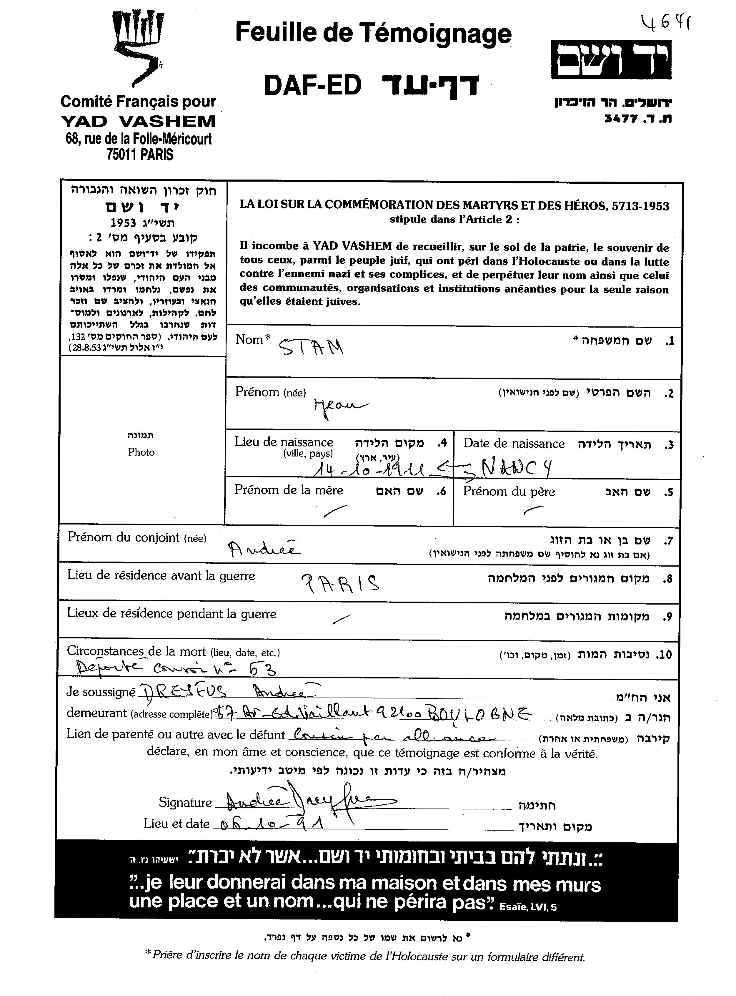 Jean ז'ן סטם נולד בNancy שבצרפת בשנת 1911. הוא היה נשוי לאנדרה. לפני מלחמת העולם השניה התגורר בParis שבצרפת. בזמן המלחמה הוא היה בצרפת שבצרפת. הוא נרצח בשואה. מקום המוות: Auschwitz שבפולין.