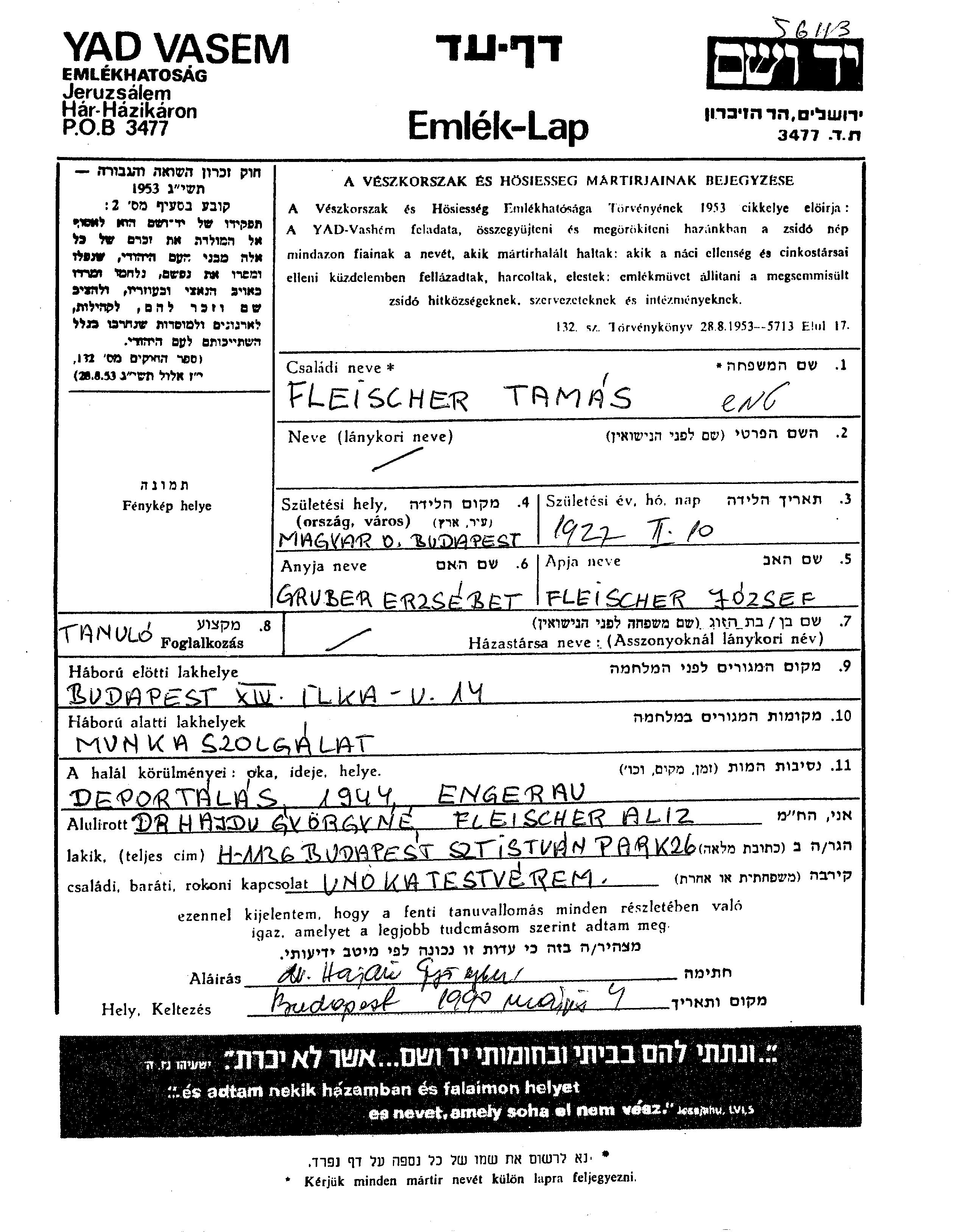 Tamas Fleischer נולד בBudapest שבהונגריה בשנת 1927 לJozsef וErzsebet לבית גרובר. הוא היה סטודנט. לפני מלחמת העולם השניה התגורר בBudapest שבהונגריה. בזמן המלחמה הוא היה בBudapest שבהונגריה.