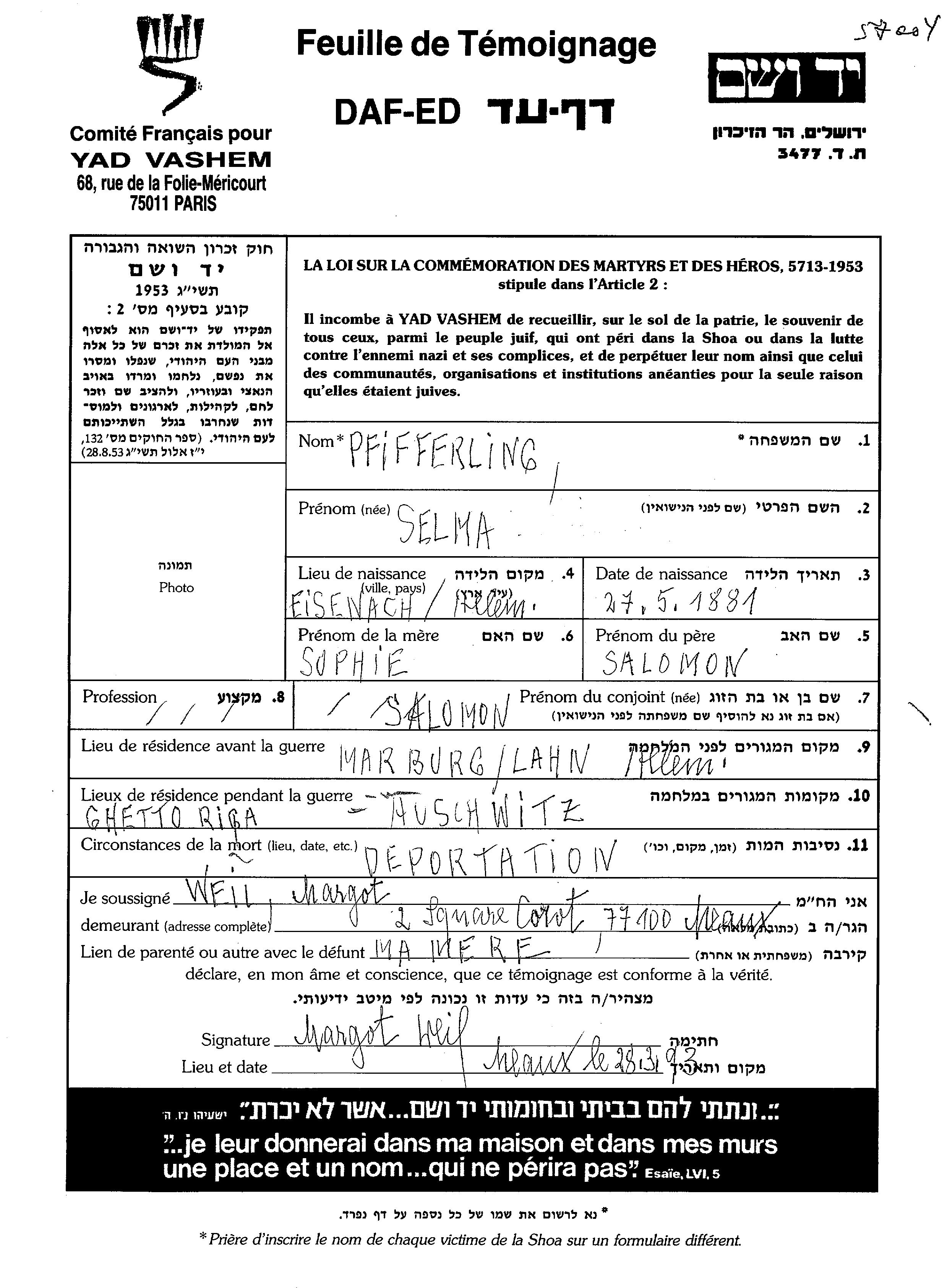 סלמה Pfifferling נולדה בEisenach שבגרמניה בשנת 1881 לSalomon וSophie. היא היתה נשואה לSalomon. לפני מלחמת העולם השניה התגוררה בMarburg Lahn שבגרמניה. בזמן המלחמה היא היתה בRiga שבלטביה.