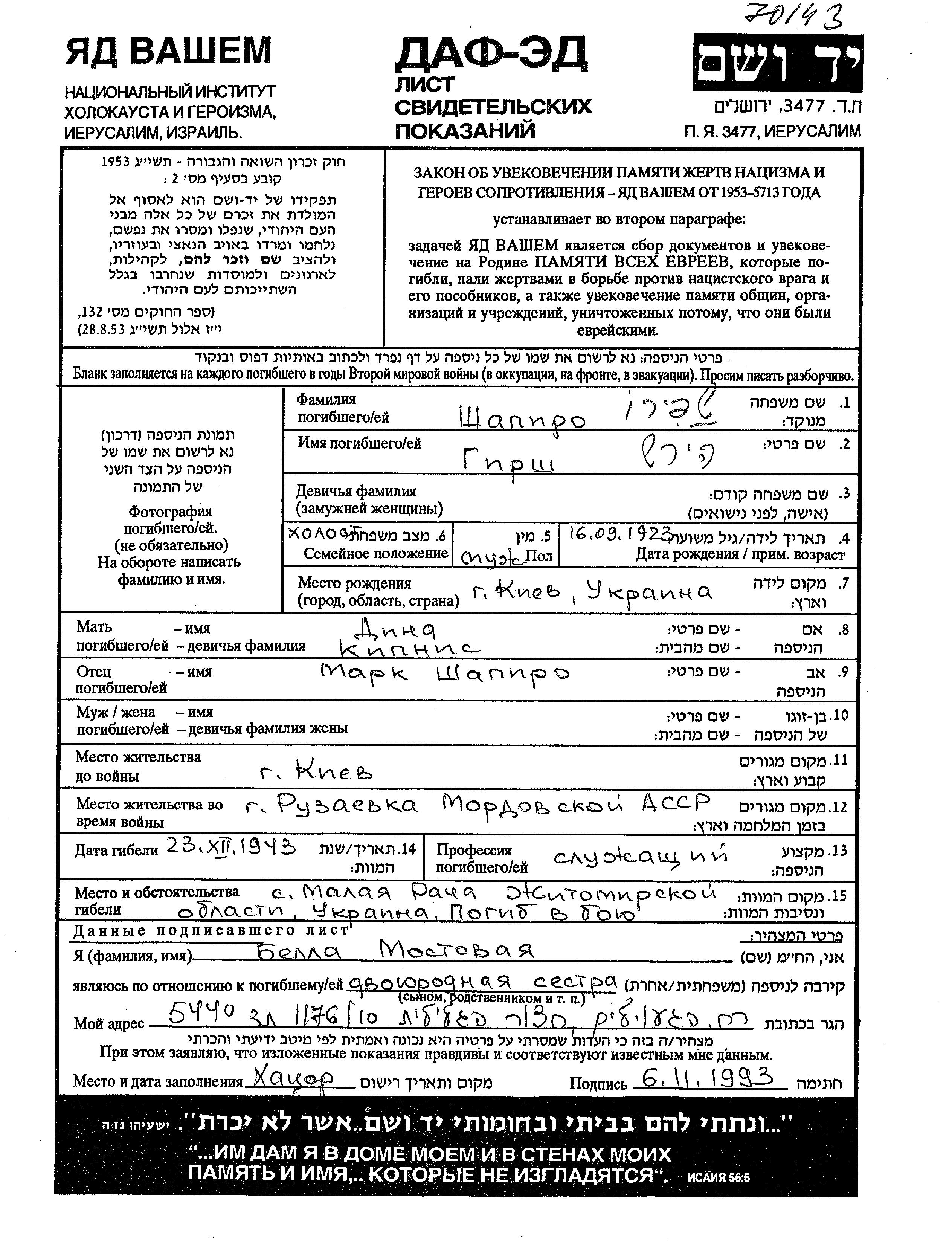 גירש שפירו נולד בKiyev שבאוקראינה (ברה"מ) בשנת 1923 למרק ודינה לבית קיפניס. הוא היה פקיד ורווק. לפני מלחמת העולם השניה התגורר בKiyev שבאוקראינה (ברה"מ).