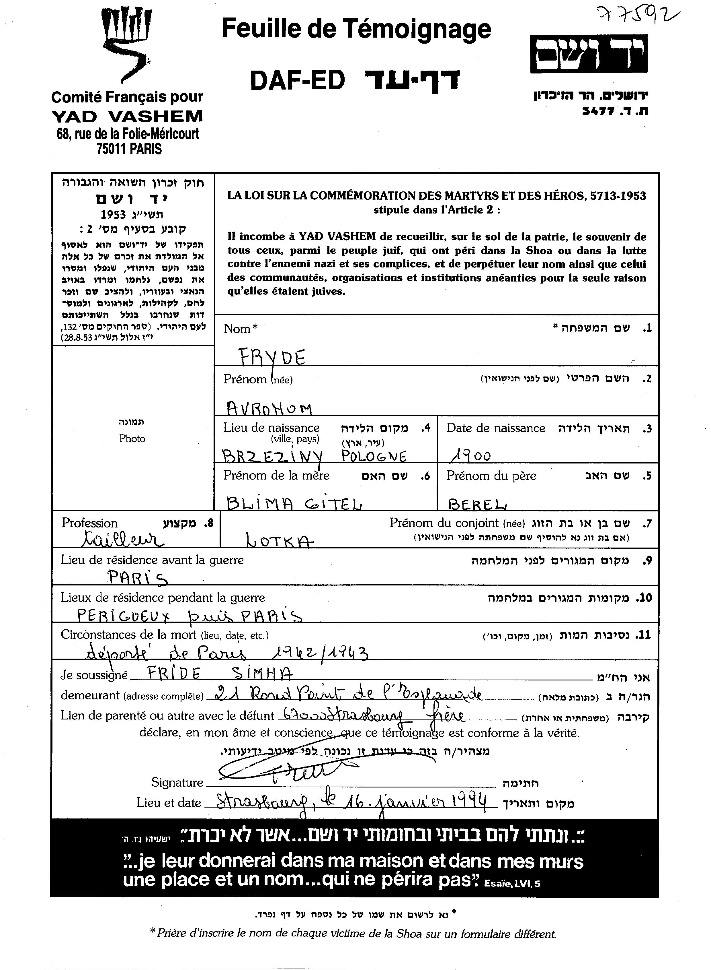 Avrohom Fryde נולד בBrzeziny שבפולין בשנת 1900 לברל וBlima גיטל. הוא היה חייט ונשוי לLotke. לפני מלחמת העולם השניה התגורר בParis שבצרפת. בזמן המלחמה הוא היה בParis שבצרפת.