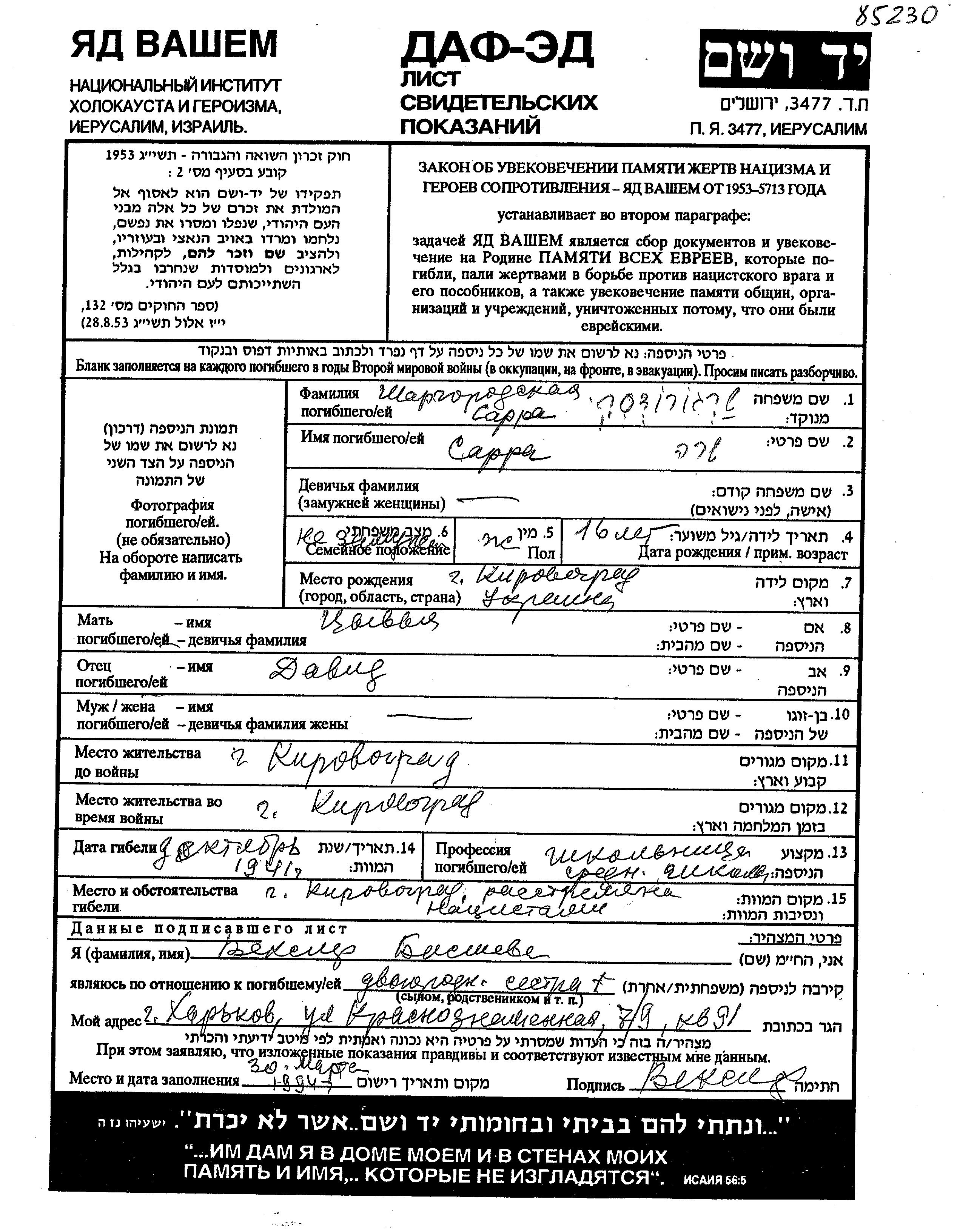 שרה נרצחה בשואה. מקום המוות: Kirovograd שבאוקראינה (ברה"מ) בשנת 1941.