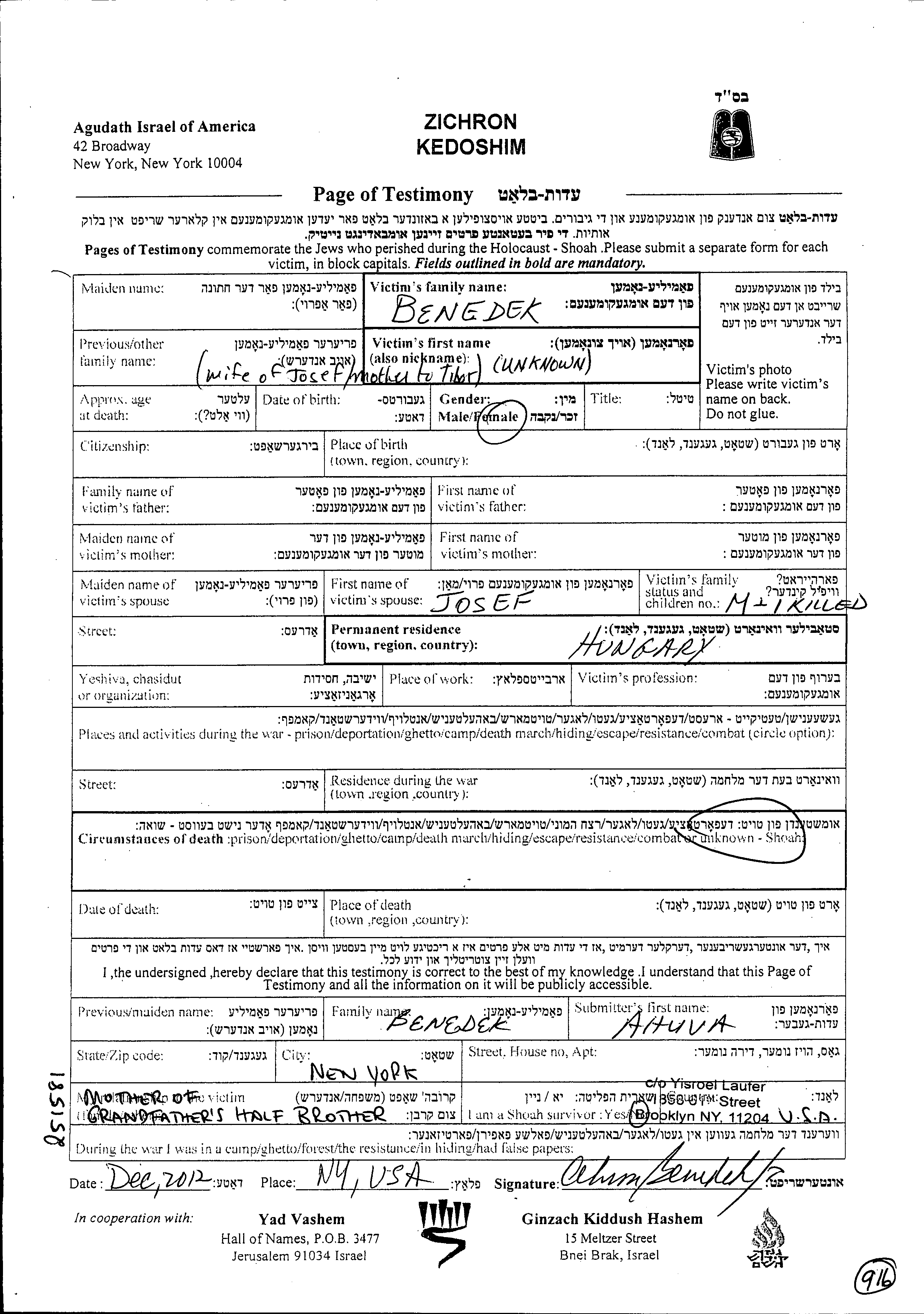 שם פרטי לא ידוע Benedek. היא היתה נשואה לJosef. לפני מלחמת העולם השניה התגוררה בהונגריה.