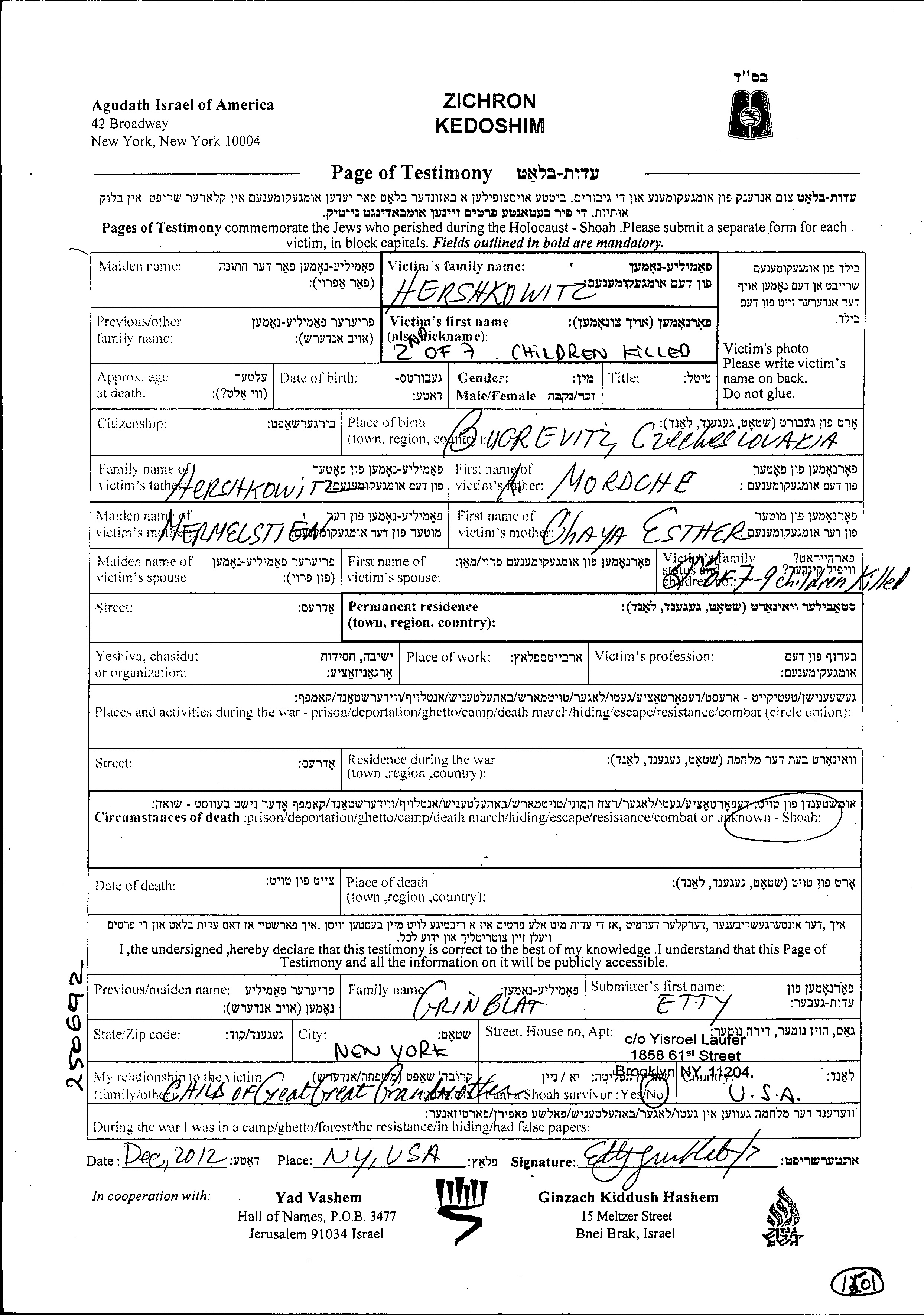 שם פרטי לא ידוע Hershkowitz נולד/ה בBogrovic שבצ'כוסלובקיה לMordche וChaya Esther לבית Mermelstein. הוא/היא היה/היתה ילד/ילדה.