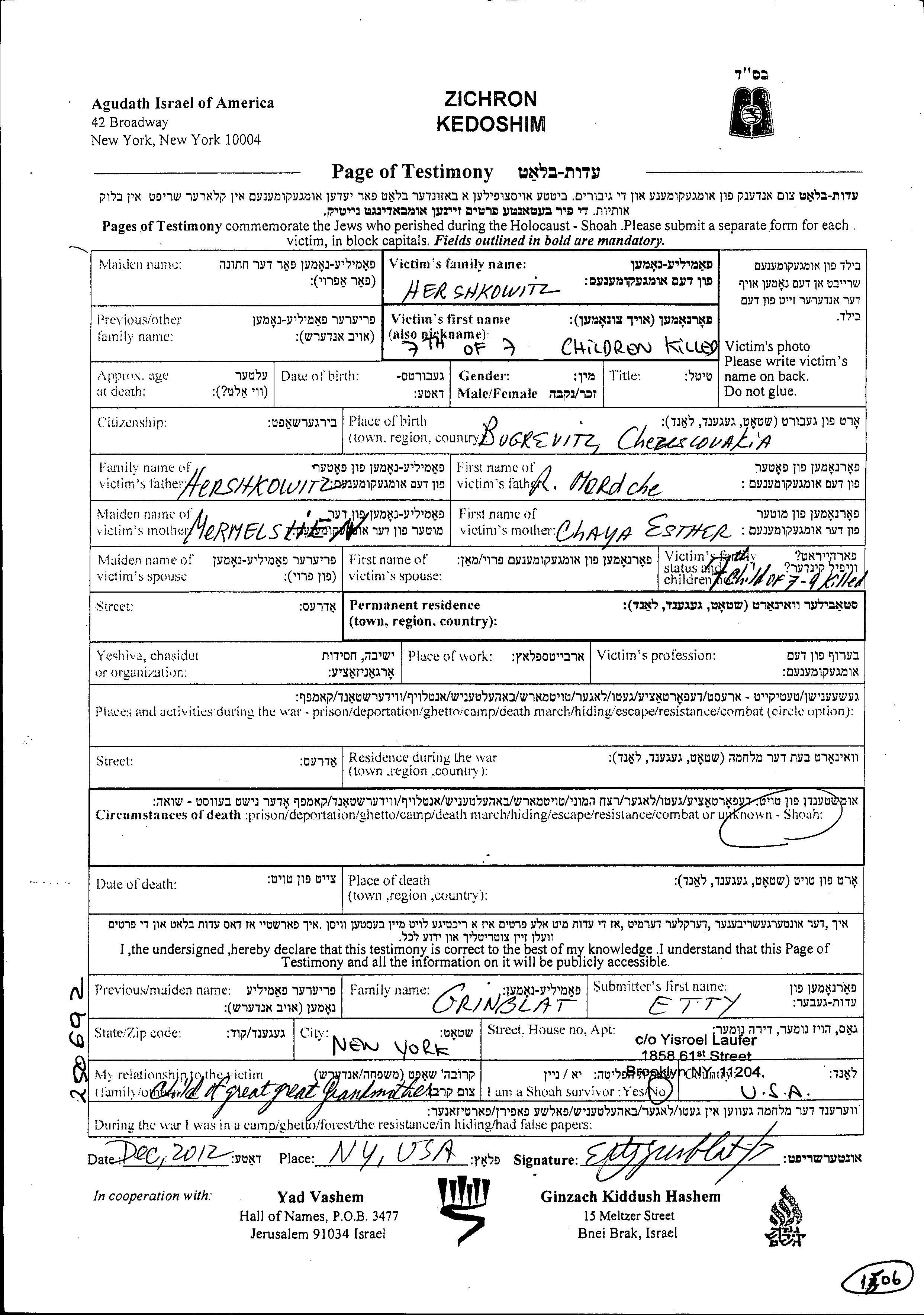 שם פרטי לא ידוע Hershkowitz נולד/ה בBogrovic שבצ'כוסלובקיה לMordche וChaya Esther לבית Mermelstein. הוא/היא היה/היתה ילד/ילדה.