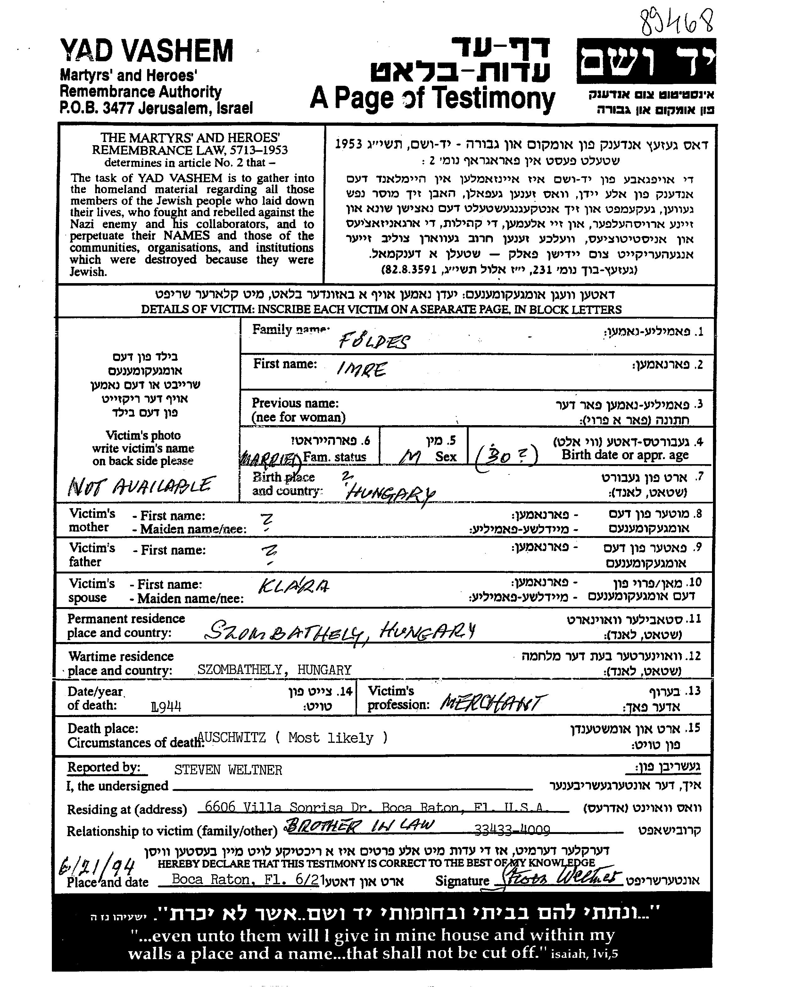 אימרה Foldes נולד בהונגריה. הוא היה סוחר ונשוי לקלרה. לפני מלחמת העולם השניה התגורר בSzombathely שבהונגריה. בזמן המלחמה הוא היה בSzombathely שבהונגריה.