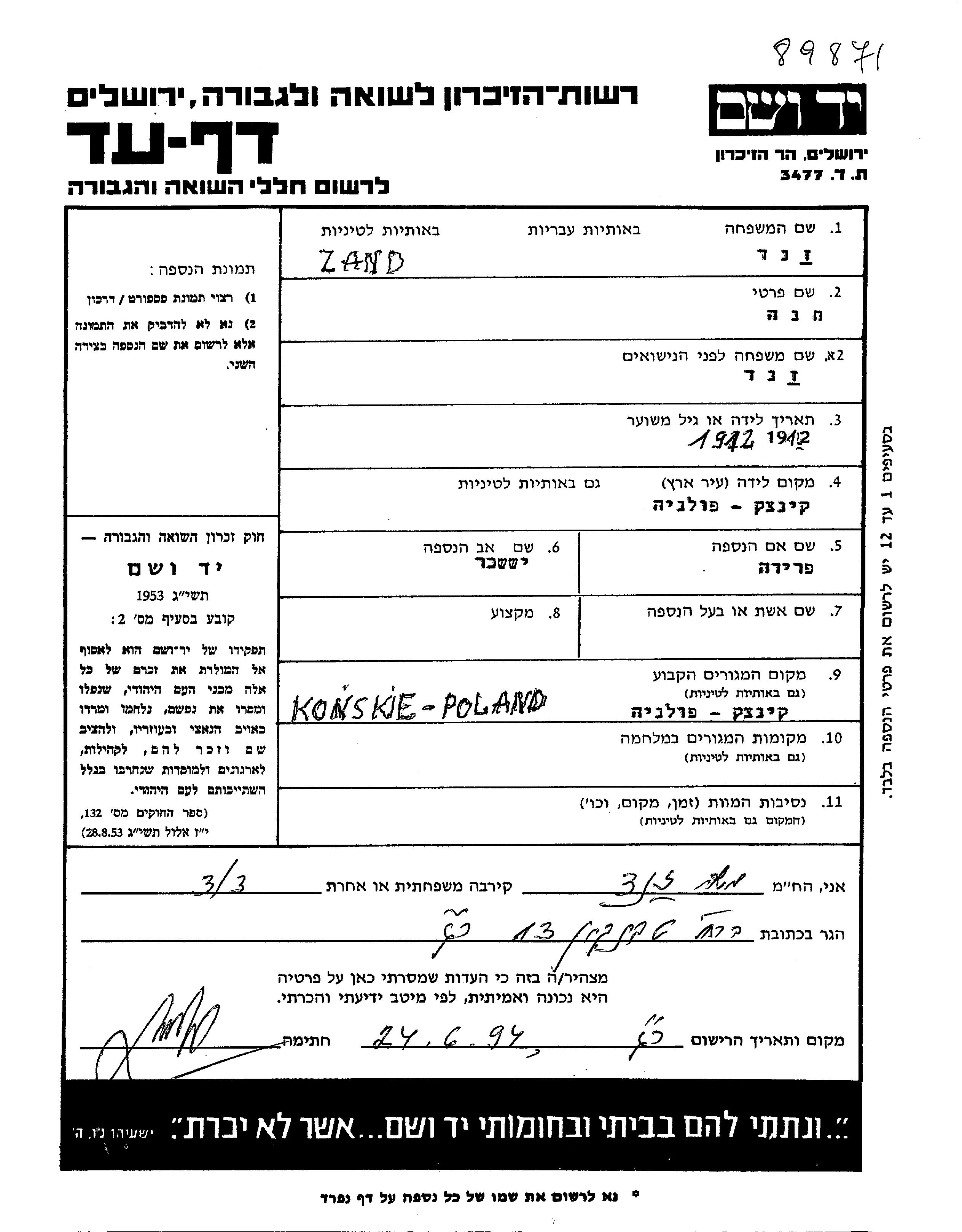 חנה זנד נולדה בKońskie שבפולין בשנת 1912 לIssachar ופרידה. לפני מלחמת העולם השניה התגוררה בKońskie שבפולין.