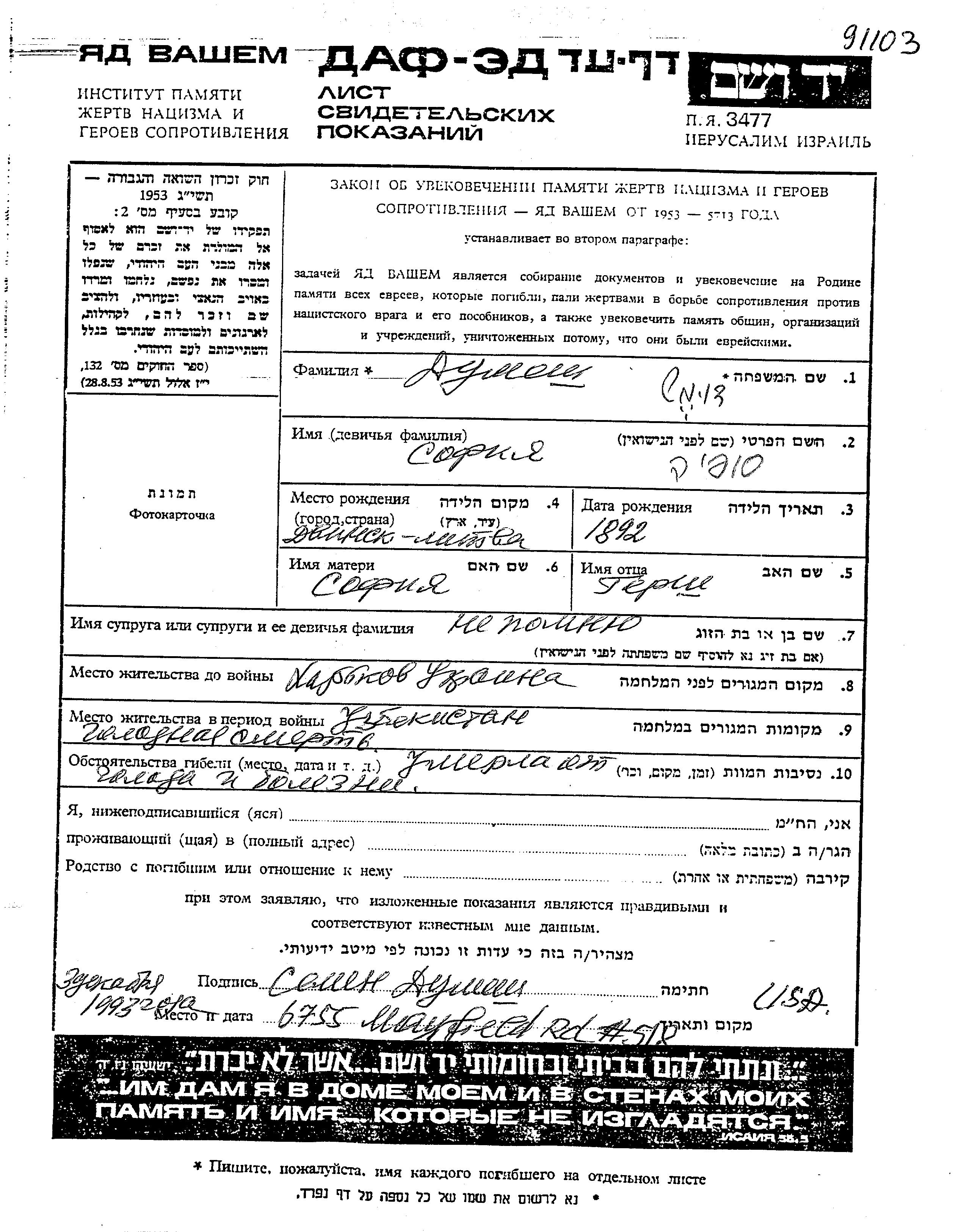 סופיה דומש נולדה בDvinsk שבלטביה בשנת 1892 לגרש וסופיה. לפני מלחמת העולם השניה התגוררה בKharkov שבאוקראינה (ברה"מ). בזמן המלחמה היא היתה באוזבקיסטן (ברה"מ). סופיה נרשם/ה בעקבות הפינוי\ באזורים הפניים של ברית המועצות.