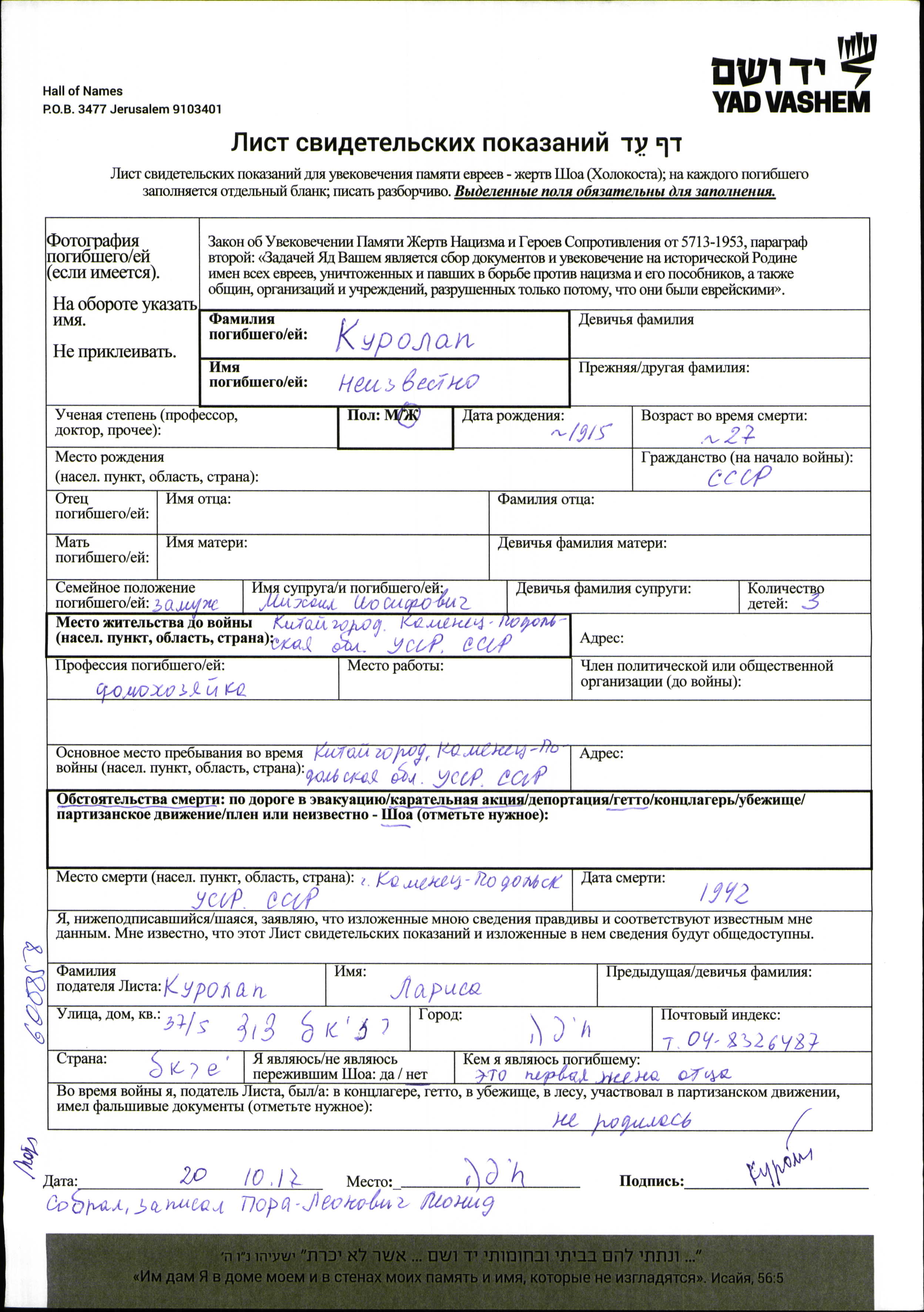 היא נרצחה בשואה. מקום המוות: Kamenets Podolskiy שבאוקראינה (ברה"מ) בשנת 1942.