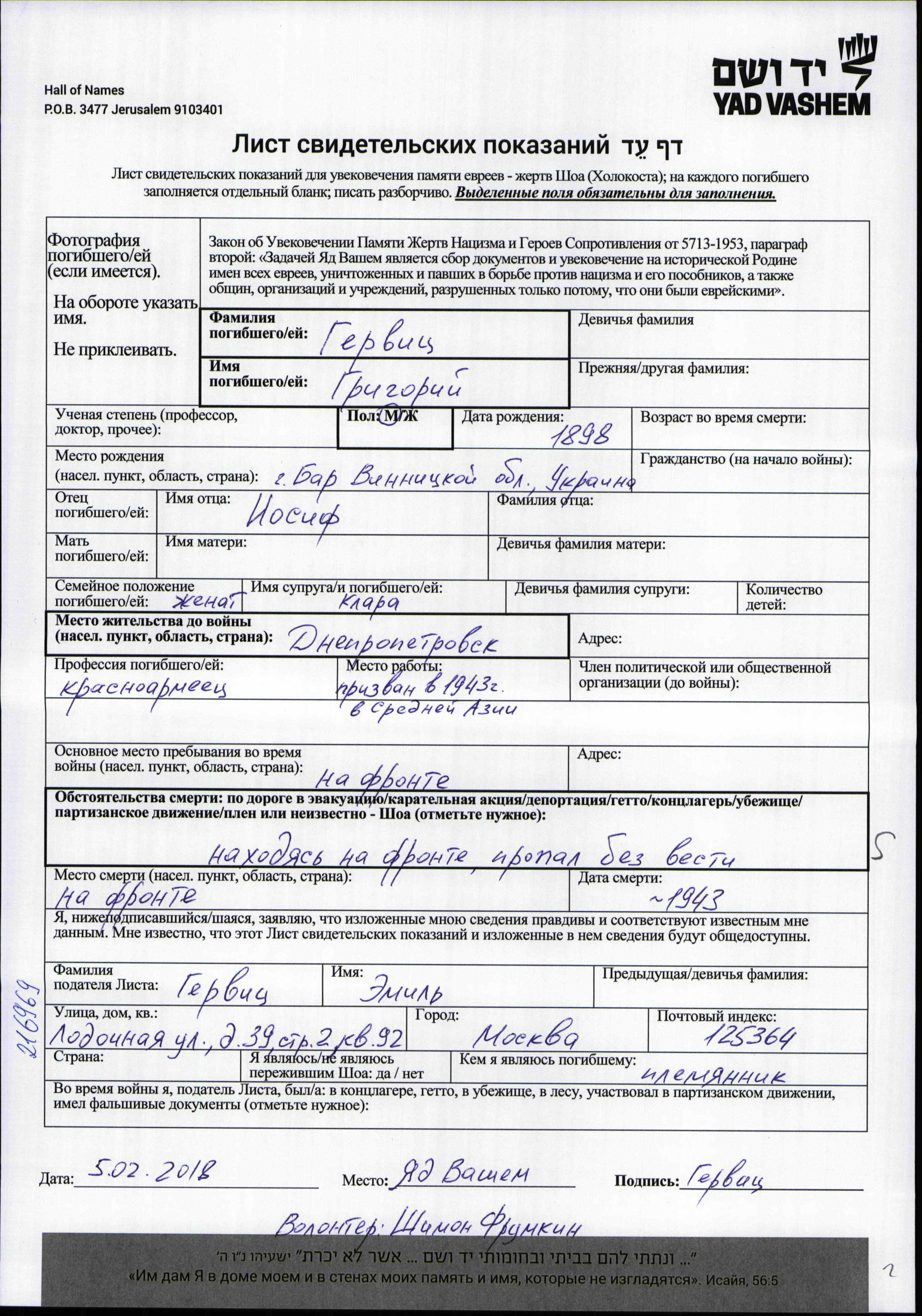 גריגורי נרצח בשואה. מקום המוות: לא ידוע בשנת 1943.