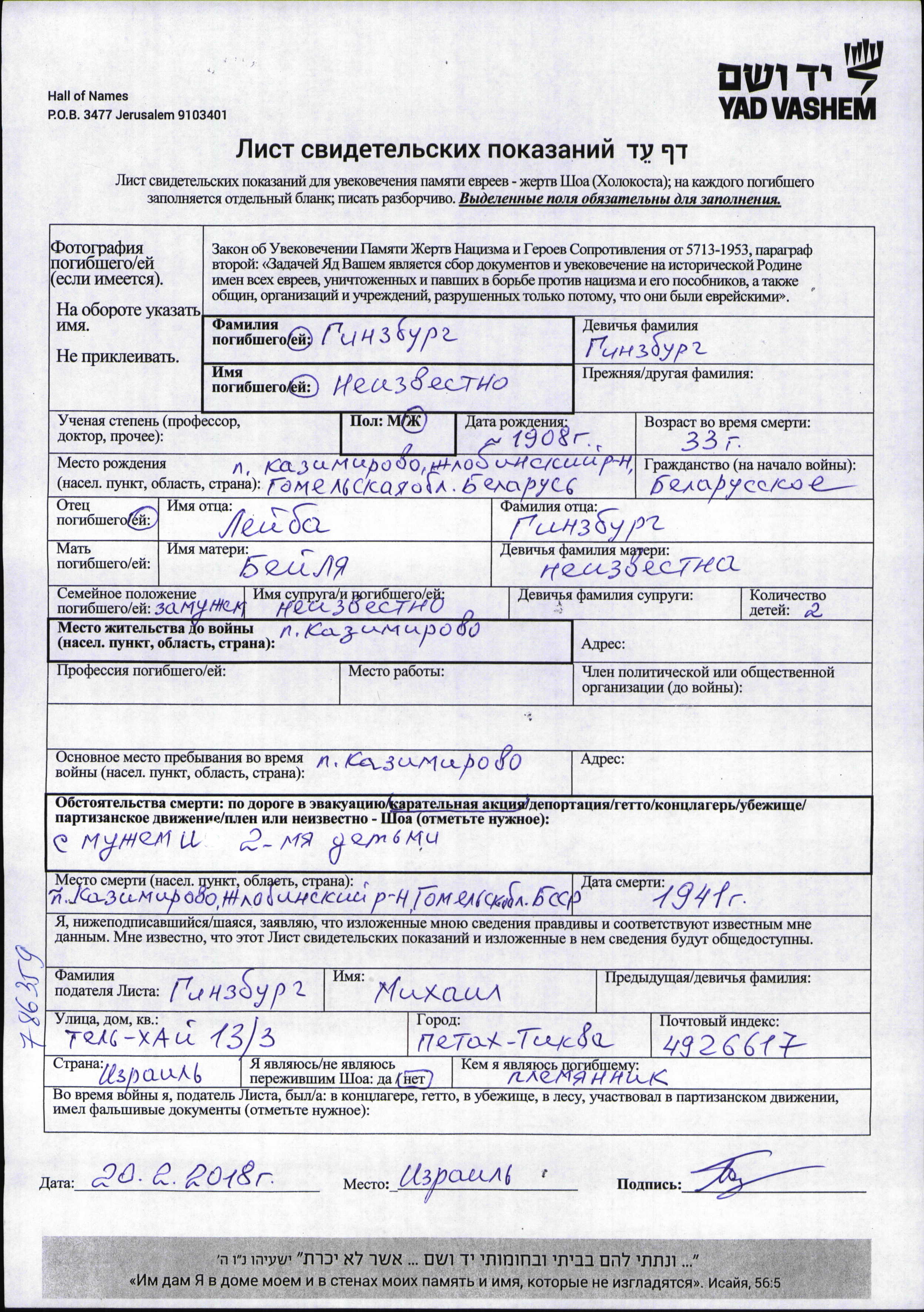 גינזבורג שם פרטי לא ידוע 1908 Kazimirovo, ביאלורוסיה (ברה"מ) דף-עד