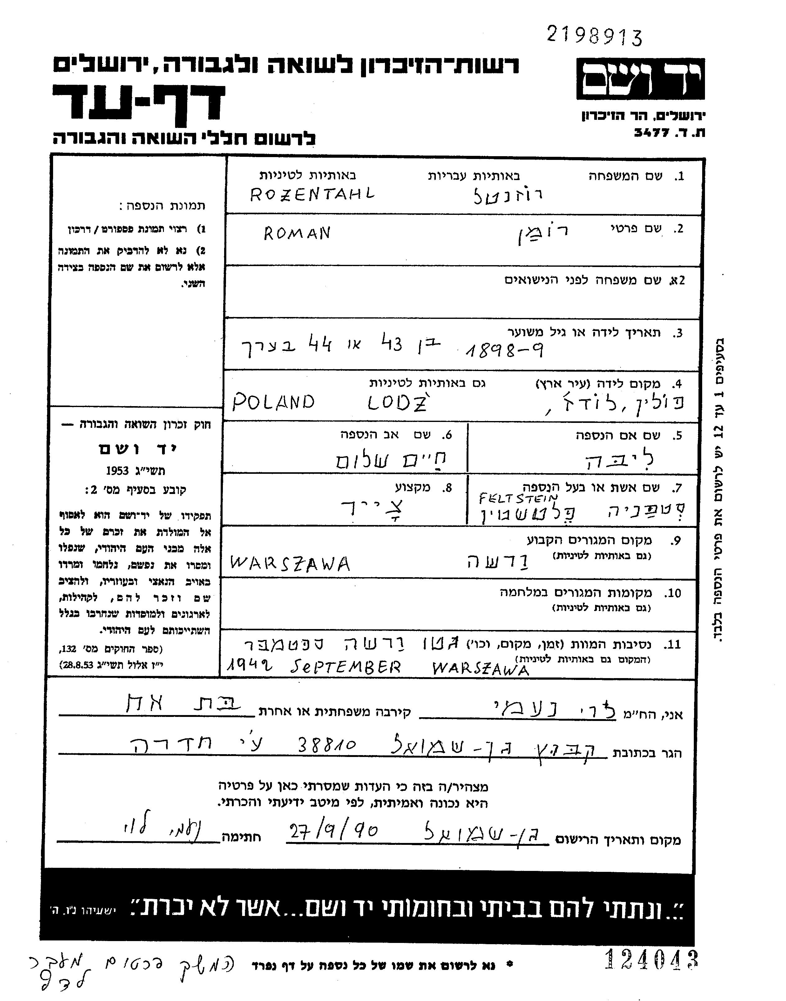 רומן נרצח בשואה. מקום המוות: Warszawa שבפולין בשנת 1942.