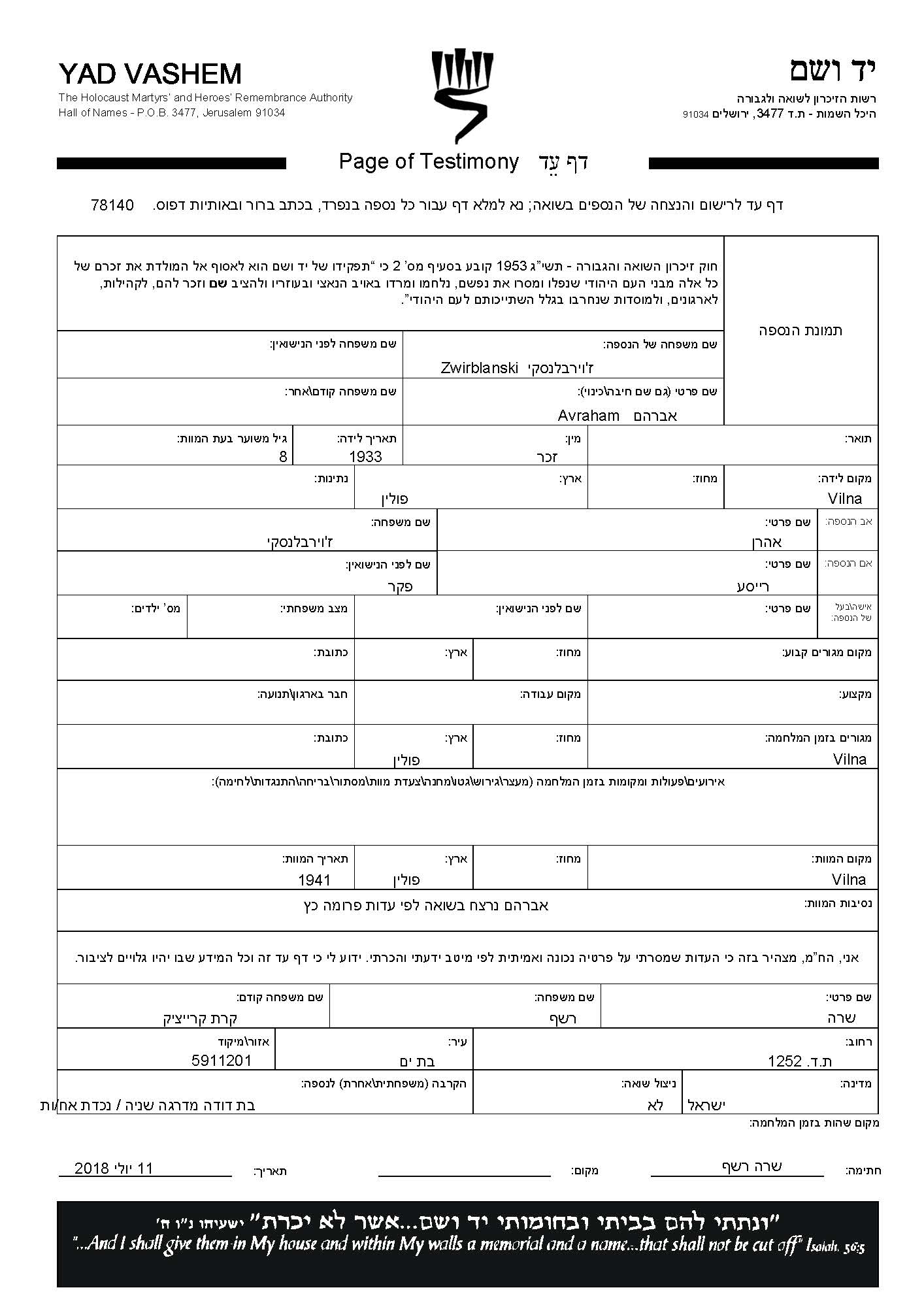 Avraham Zwirblanski נולד בVilna שבפולין בשנת 1933 לאהרן ורייסע לבית פקר. הוא היה ילד. בזמן המלחמה הוא היה בVilna שבפולין.