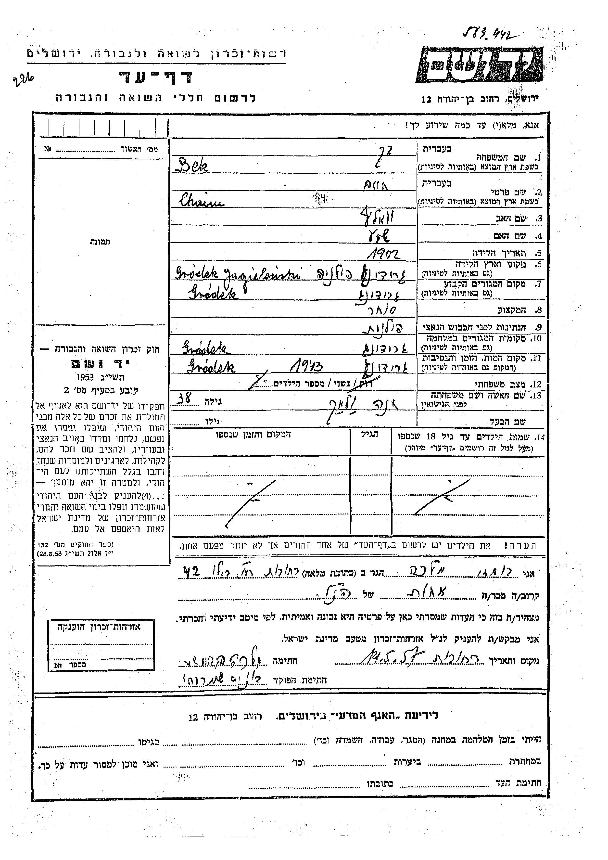 Chaiim בק נולד בGródek שבפולין בשנת 1902 לוואלף ושבע. הוא היה סוחר ורווק. לפני מלחמת העולם השניה התגורר בGródek שבפולין. בזמן המלחמה הוא היה בGródek שבפולין.
