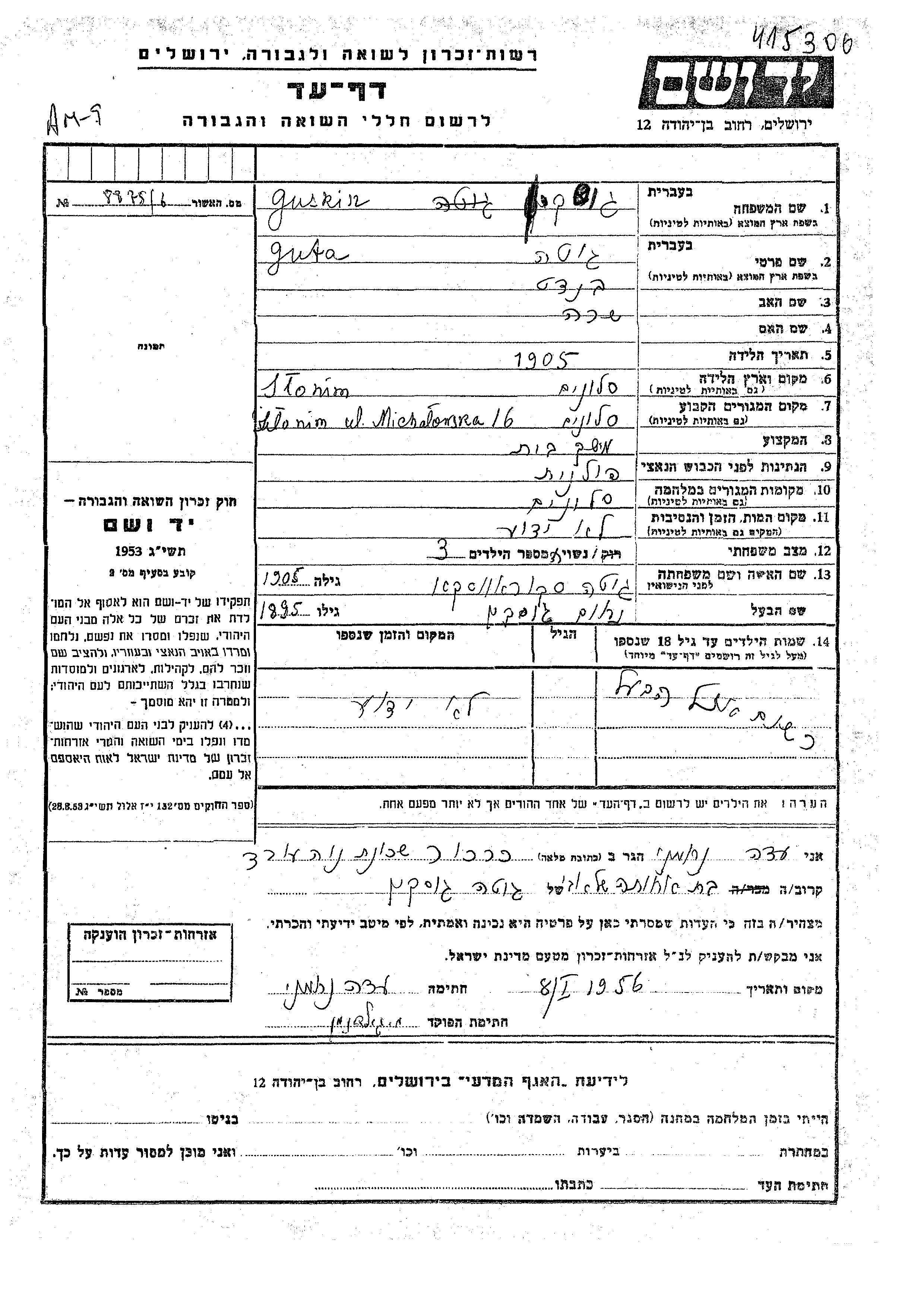 גוטה גוסקין לבית סקוראווסקא נולדה בSlonim שבפולין בשנת 1905 לבנדט ושרה. היא היתה משק בית ונשואה לנחום. לפני מלחמת העולם השניה התגוררה בSlonim שבפולין. בזמן המלחמה היא היתה בSlonim שבפולין. גוטה נרצחה בשואה.