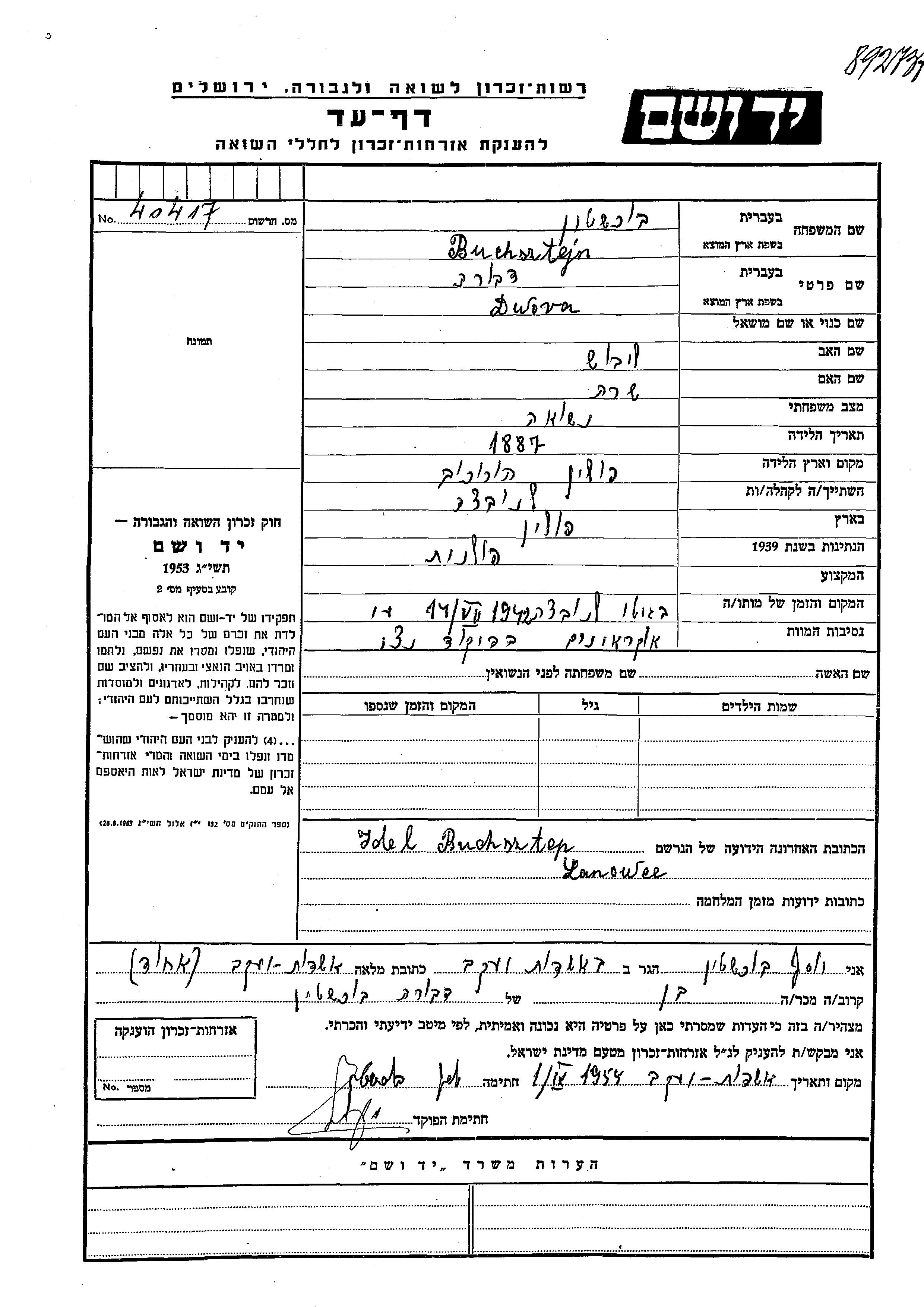 Dwora Buchsztejn נולדה בHorochow שבפולין בשנת 1887 לליבוש ושרה. היא היתה נשואה. לפני מלחמת העולם השניה התגוררה בLanovtse שבפולין. בזמן המלחמה היא היתה בLanowce שבפולין. היא נרצחה בשואה. מקום המוות: Łanowce שבפולין בשנת 1942.