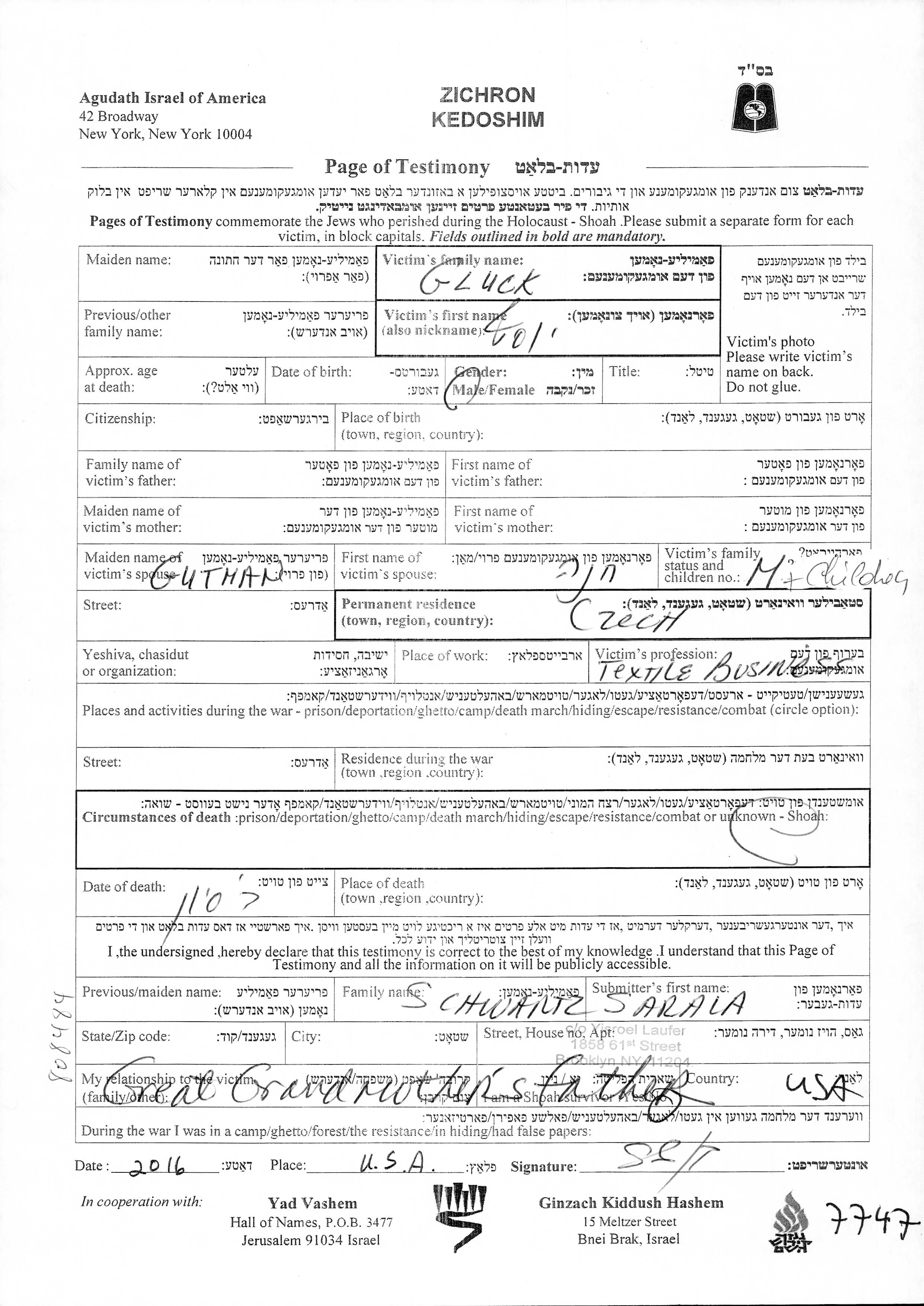 יוסף Gluck. הוא היה סוחר בדים ונשוי לחנה לבית Gutman. לפני מלחמת העולם השניה התגורר בצ'כוסלובקיה שבצ'כוסלובקיה.