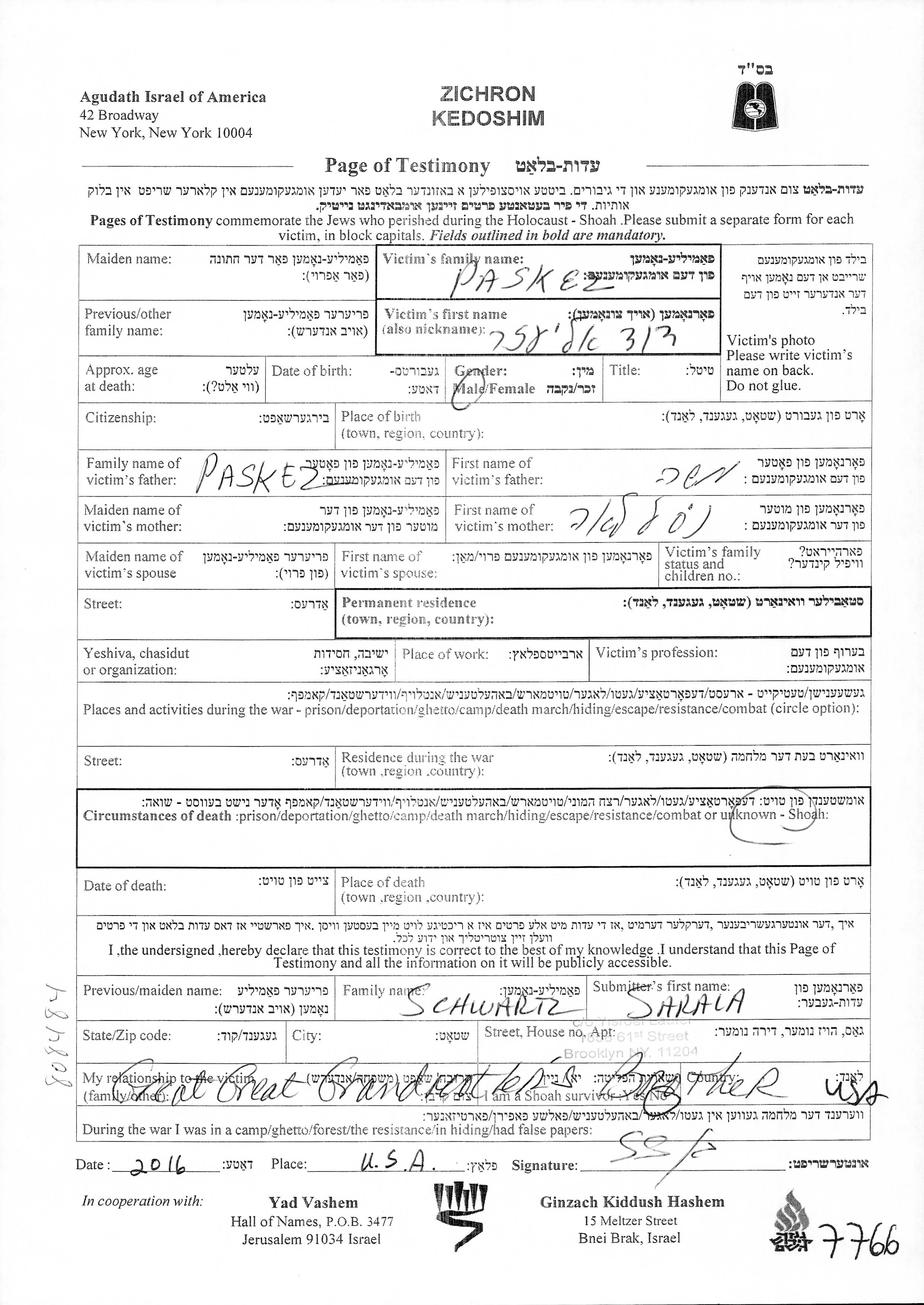 דוד אליעזר Paskez נולד למשה וניסל לאה. לפני מלחמת העולם השניה התגורר במקום לא רשום.