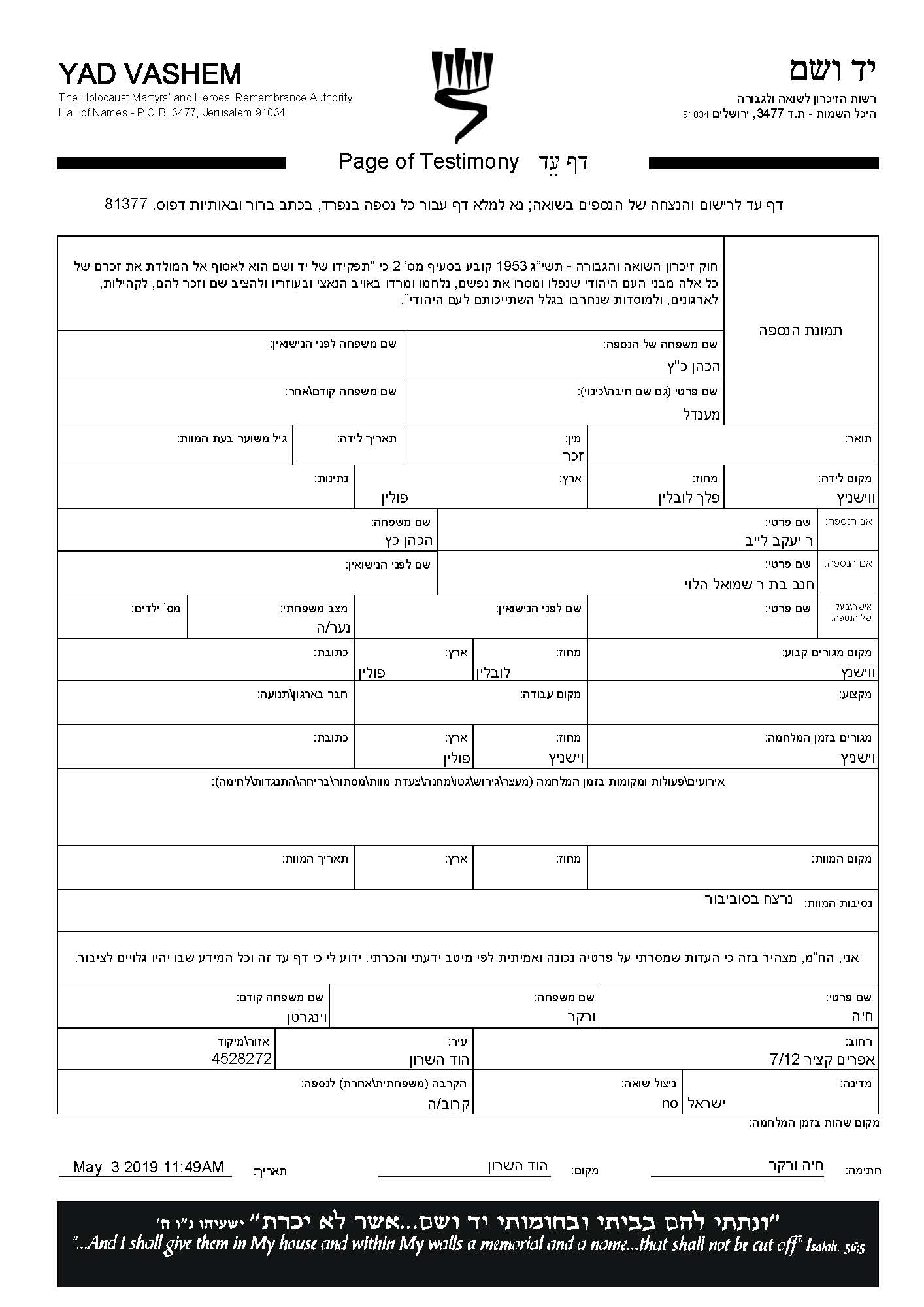 מענדל הכהן כ"ץ נולד בWisznice שבפולין ליעקב לייב וחנה. הוא היה נער. לפני מלחמת העולם השניה התגורר בWisznice שבפולין. בזמן המלחמה הוא היה בWisznice שבפולין. מענדל נרצח בשואה. מקום המוות: Sobibor שבפולין.