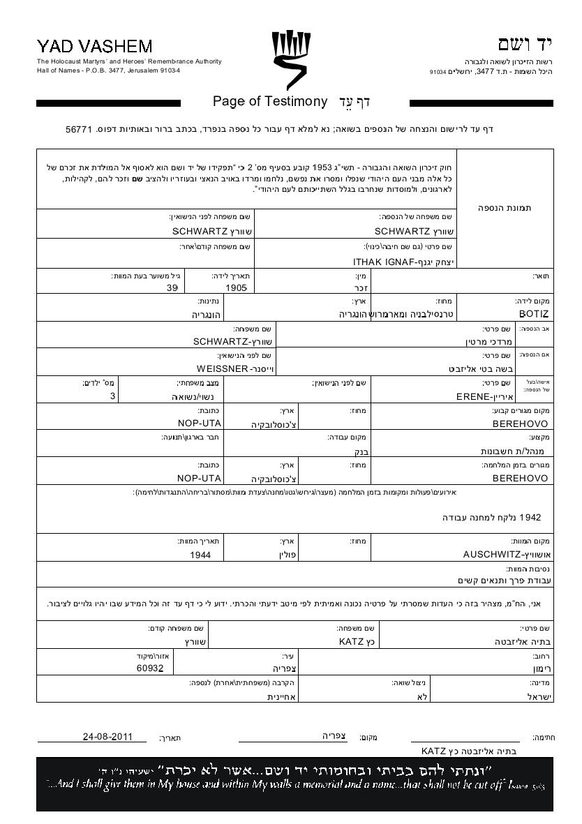 Ignacz יצחק Schwartz נולד בשנת 1905. הוא היה מנהל חשבונות. לפני מלחמת העולם השניה התגורר בBerehovo שבצ'כוסלובקיה.