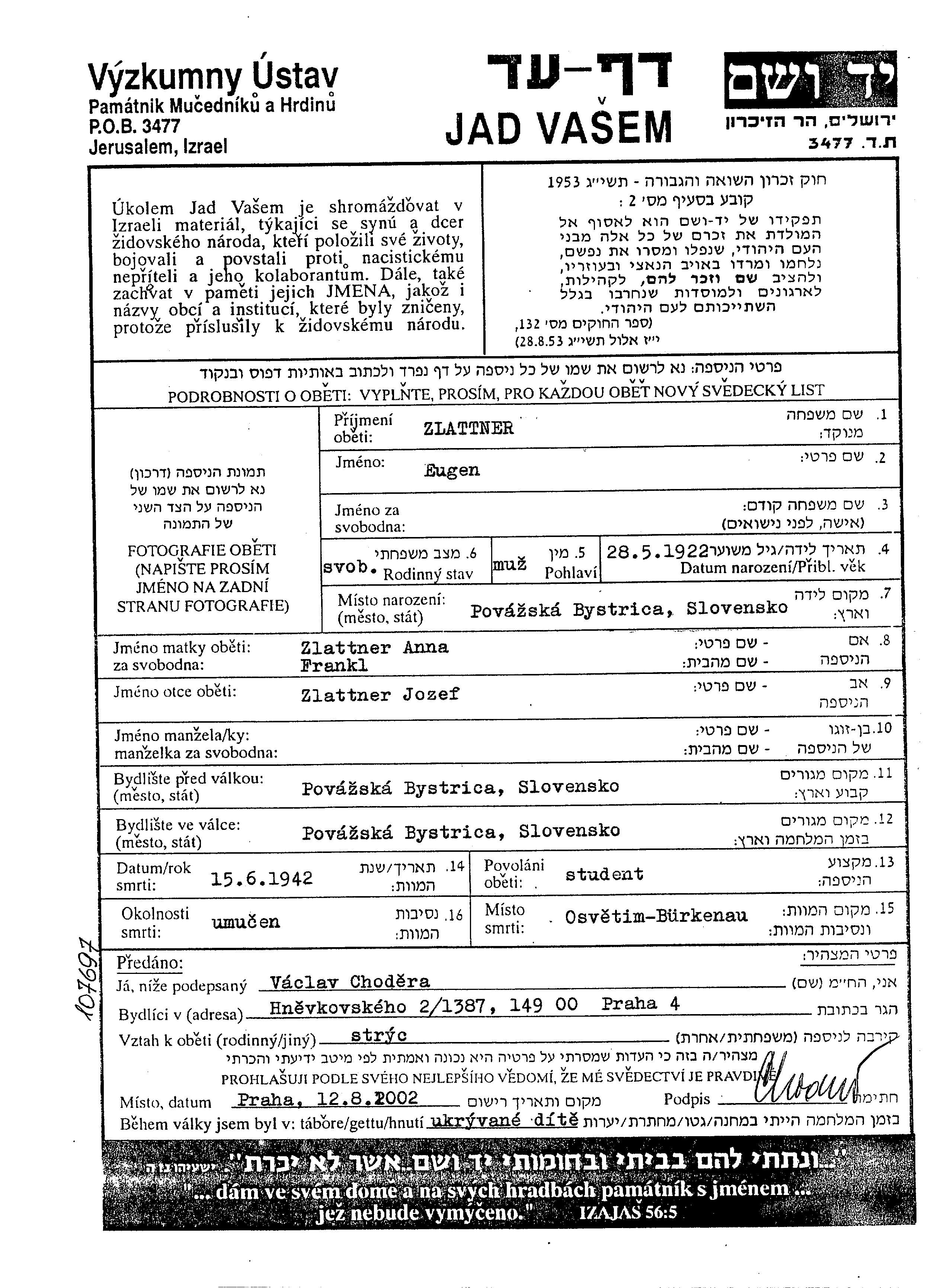 Zlattner אוגן 1922 Povazska Bystrica, צ'כוסלובקיה רשימת יהודים נרצחים באושוויץ