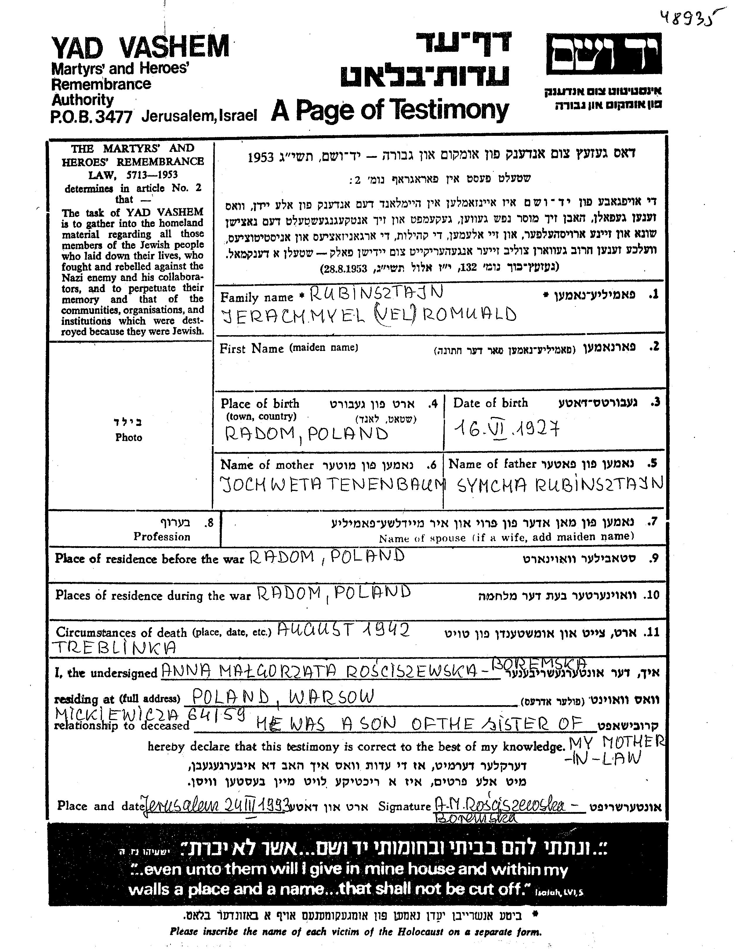 Rubinsztajn | Jerachmyel רומואלד | 1927 | Radom, פולין | דף-עד |