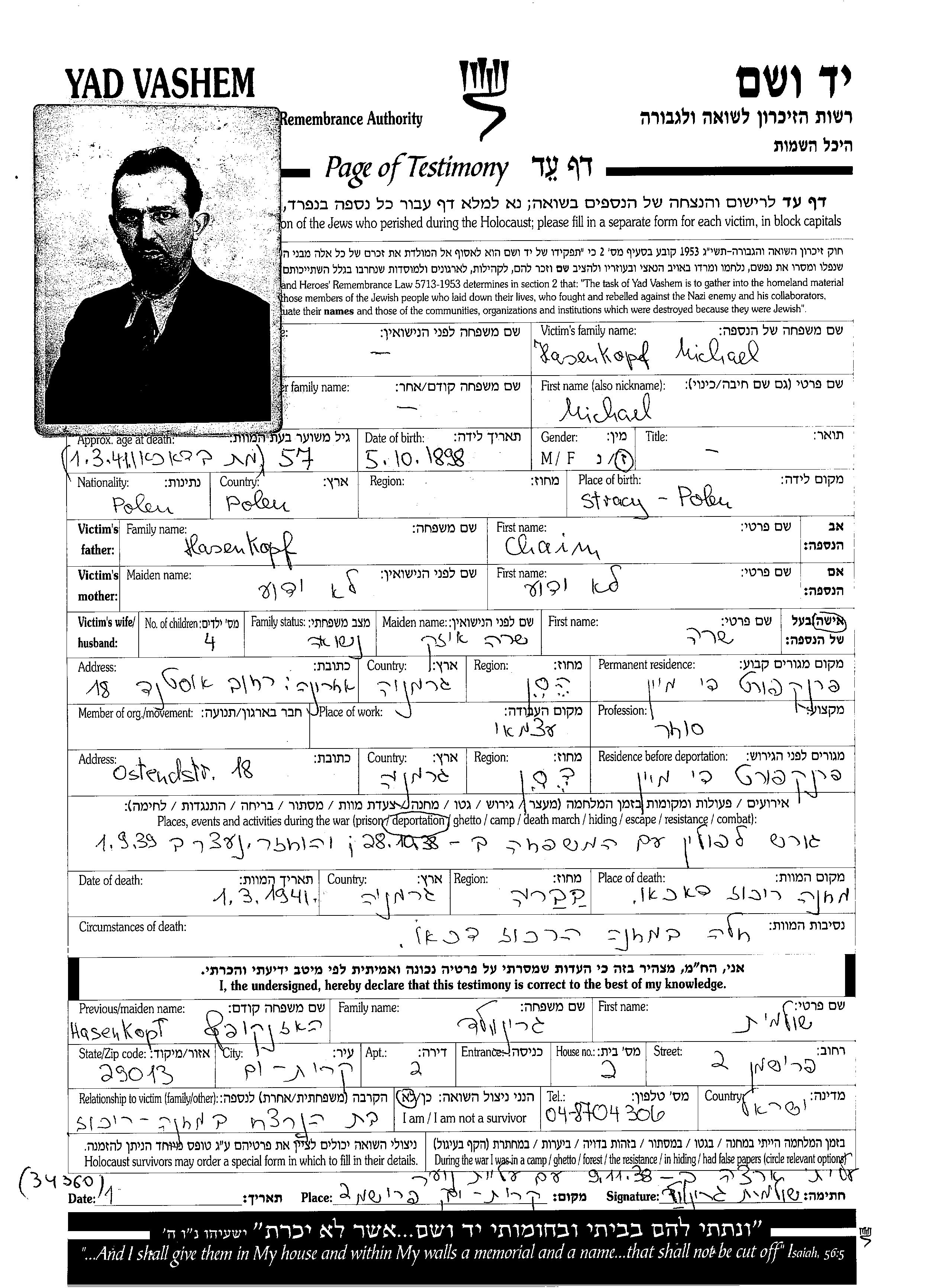 Michel Hasenkopf נולד בStrzyzow שבפולין בשנת 1898. הוא היה פועל. לפני מלחמת העולם השניה התגורר בFrankfurt am Main שבגרמניה.
