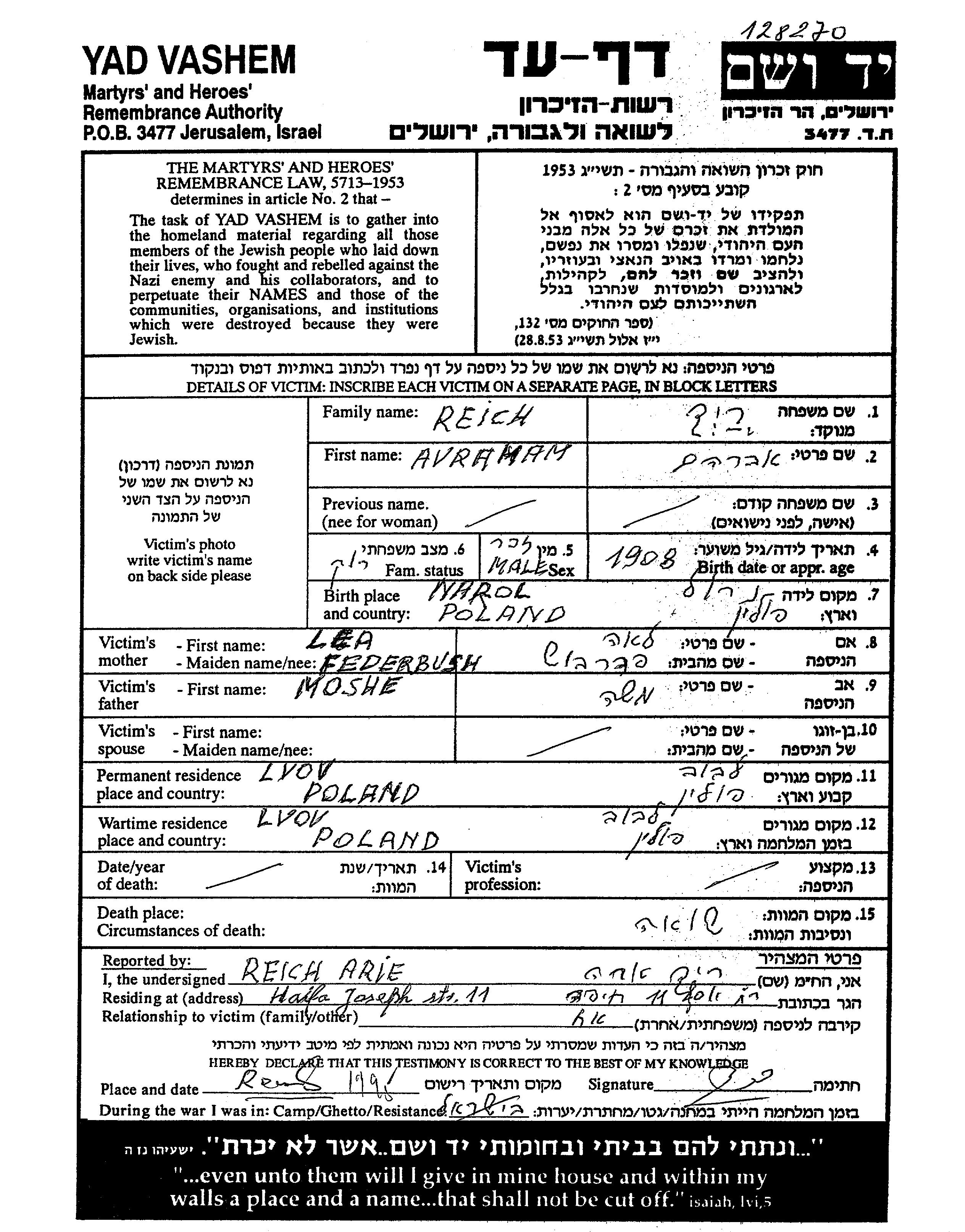 אברהם Reich נולד בNarol שבפולין בשנת 1908. הוא היה מייצר מזוודות ותיקים. לפני מלחמת העולם השניה התגורר בLwow שבפולין.