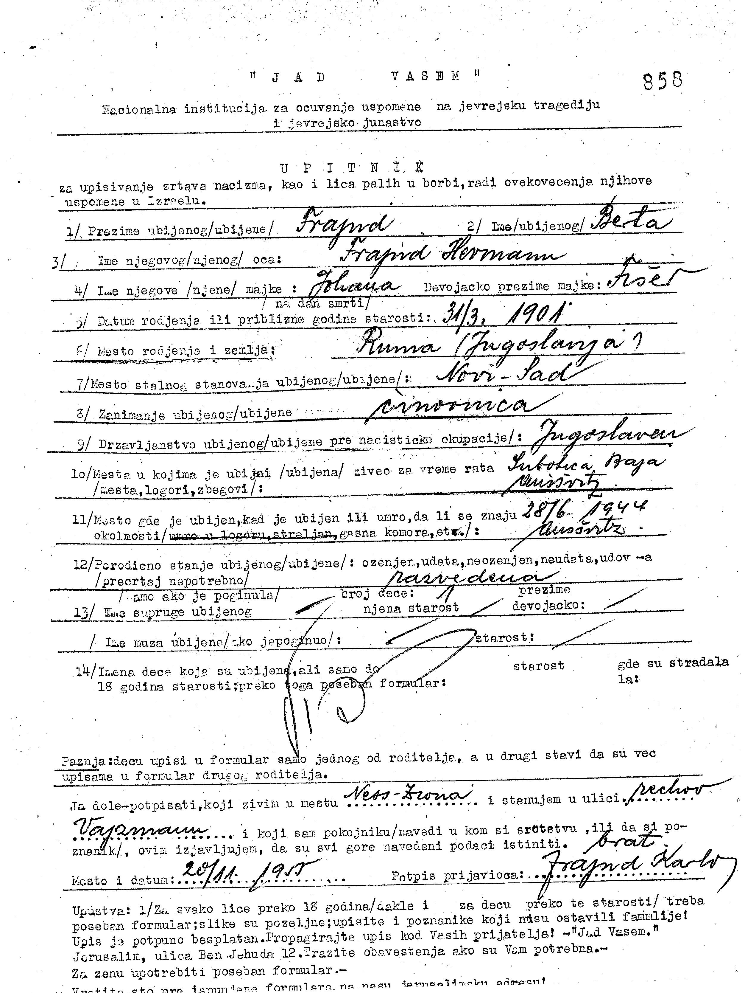 ברטה Frajnd לבית Frajnd נולדה בRuma שביוגוסלביה בשנת 1901. היא היתה פקידה. לפני מלחמת העולם השניה התגוררה בNovi Sad שביוגוסלביה.