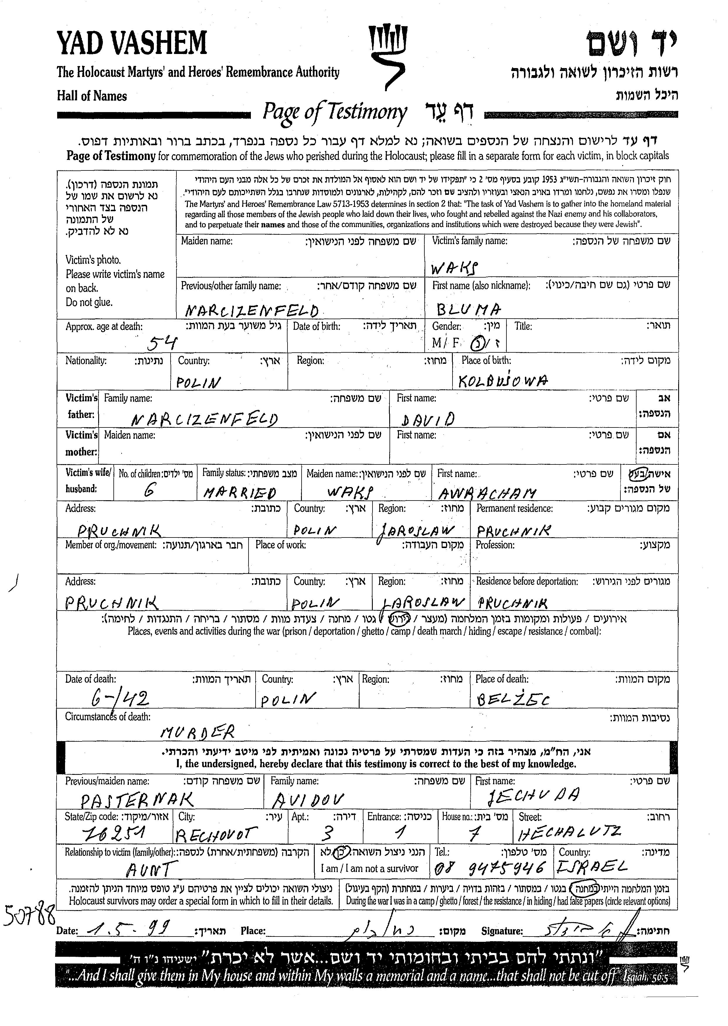 Wachs | Blima | Pruchnik, פולין | דף-עד |