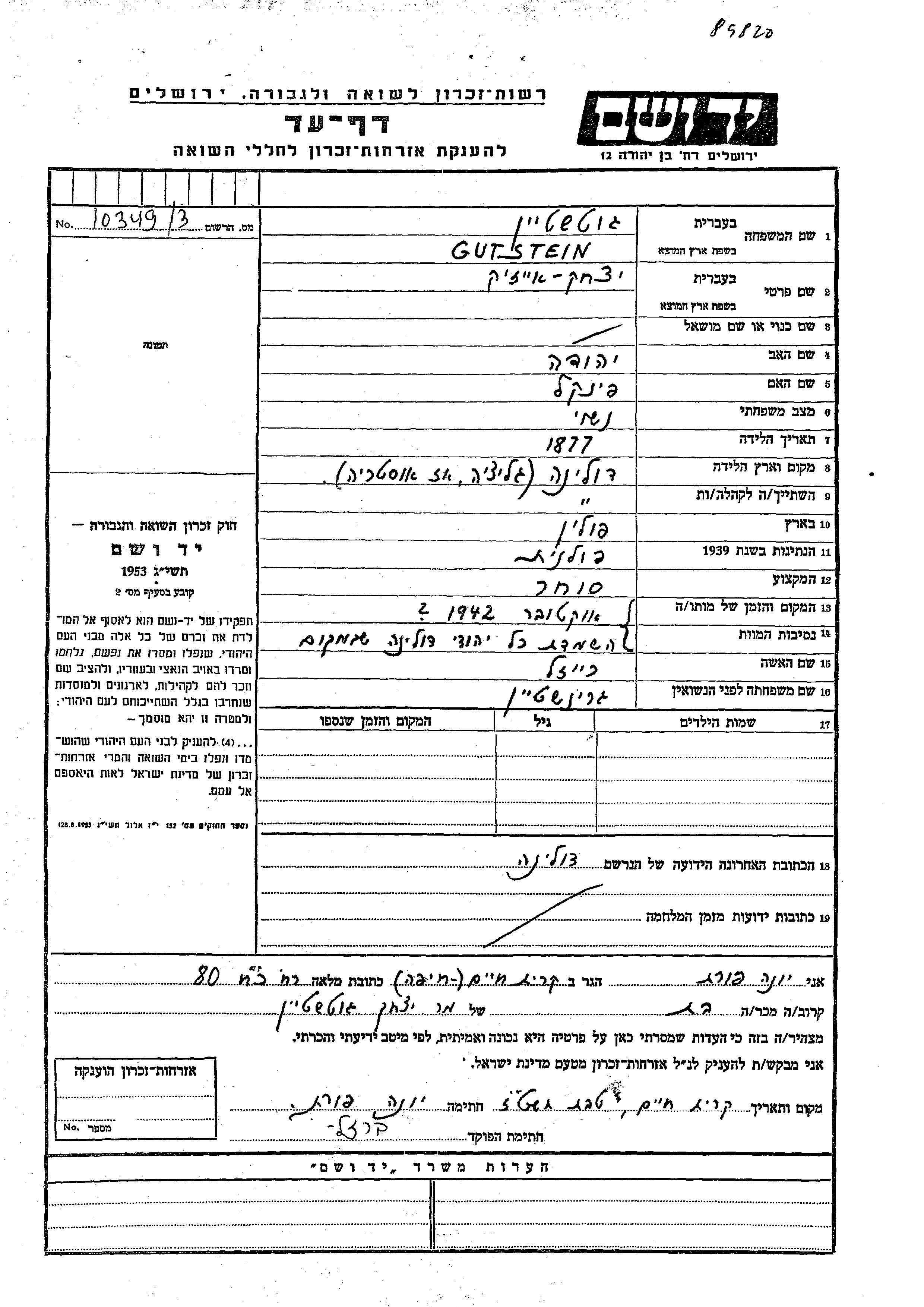 יצחק Gutstein גוטשטיין נולד בDolina שבפולין בשנת 1877. הוא היה סוחר. לפני מלחמת העולם השניה התגורר בDolina שבפולין.