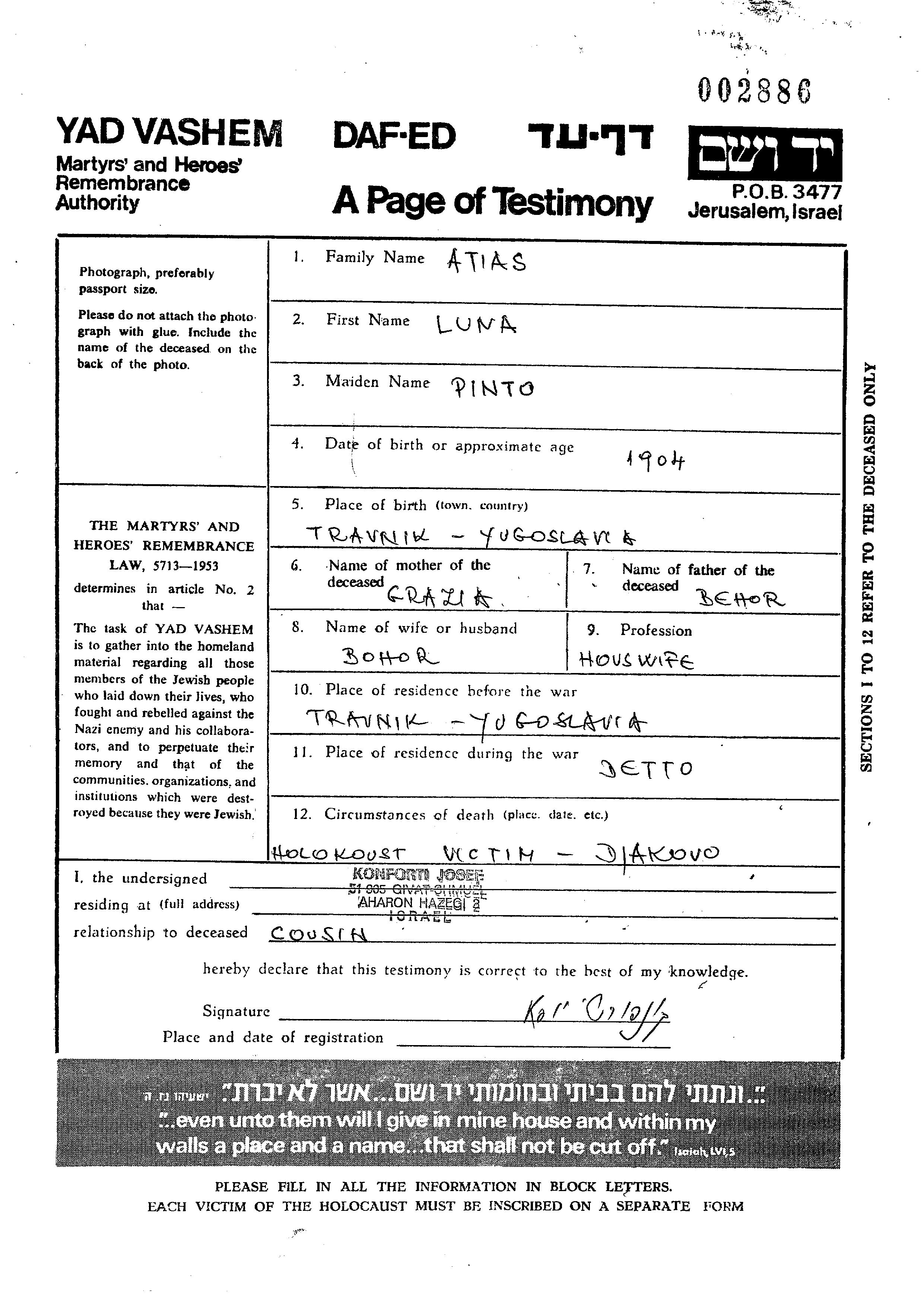 לונה אטיאס לבית פינטו נולדה בTravnik שביוגוסלביה בשנת 1904. היא היתה עקרת בית. לפני מלחמת העולם השניה התגוררה בTravnik שביוגוסלביה.