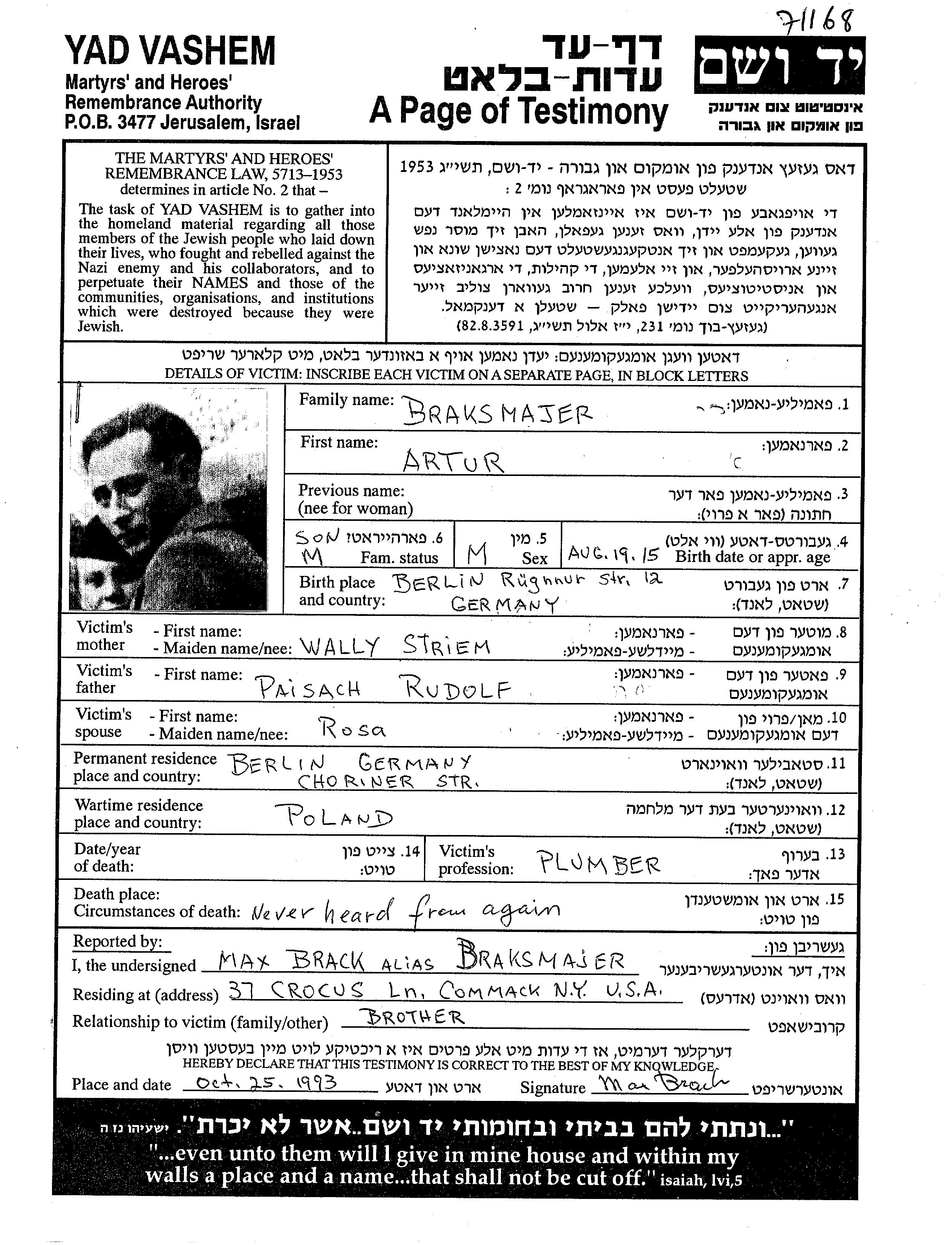 ארטור Braksmajer נולד בBerlin שבגרמניה בשנת 1915. הוא היה שרברב. לפני מלחמת העולם השניה התגורר בBerlin שבגרמניה.