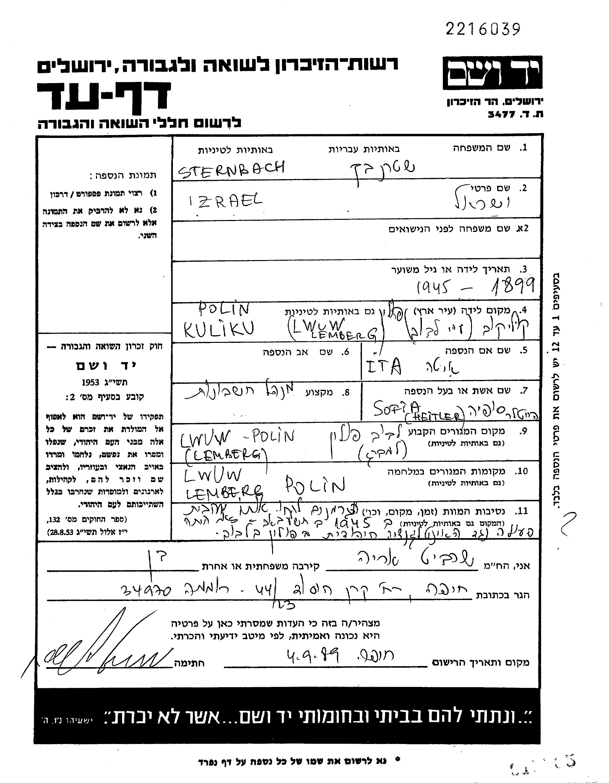 ישראל Sternbach נולד בKulikow שבפולין בשנת 1896. לפני מלחמת העולם השניה התגורר בLwow שבפולין.