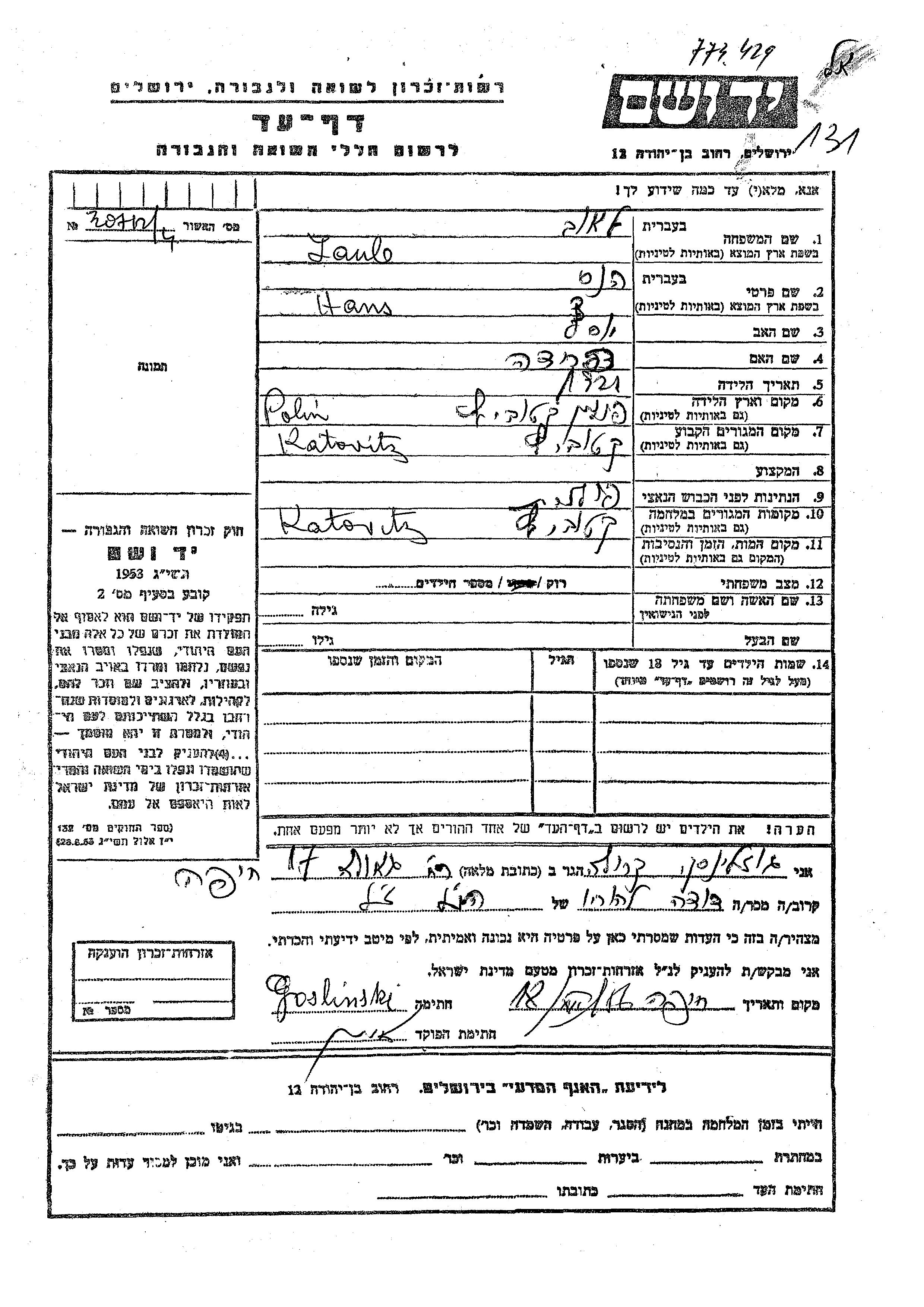 יד ושם - המפעל להנצחת השמות בדפי עד