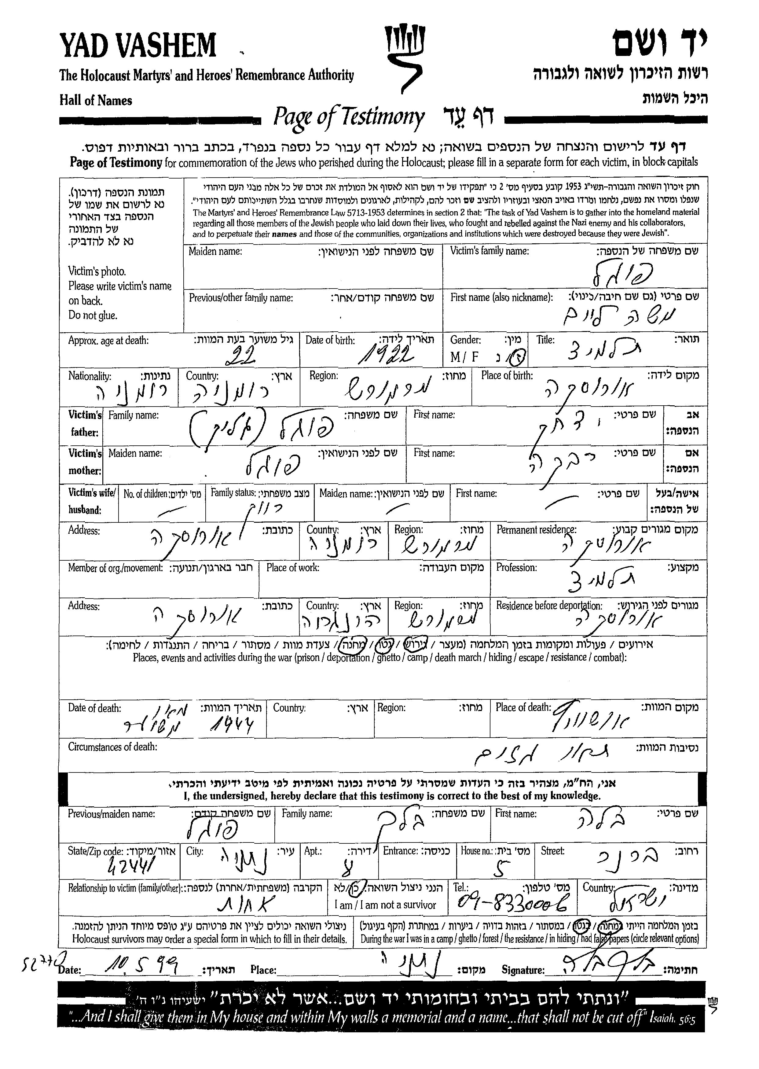 יד ושם - המפעל להנצחת השמות בדפי עד