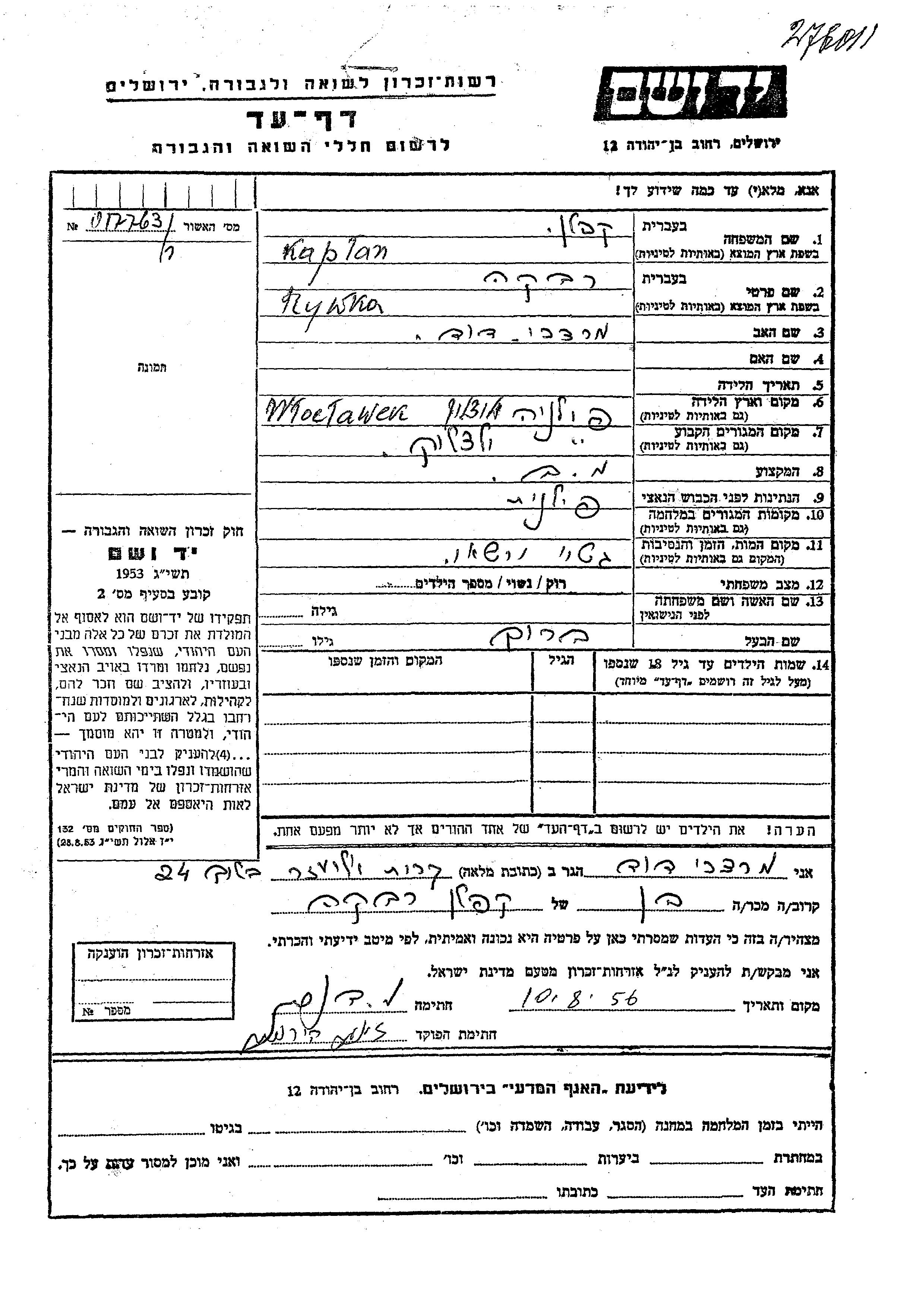 Rywka קפלן נולדה בWloclawek שבפולין למרדכי דוד. היא היתה עקרת בית ונשואה לברוך. לפני מלחמת העולם השניה התגוררה בWloclawek שבפולין. בזמן המלחמה היא היתה בWarszawa שבפולין.