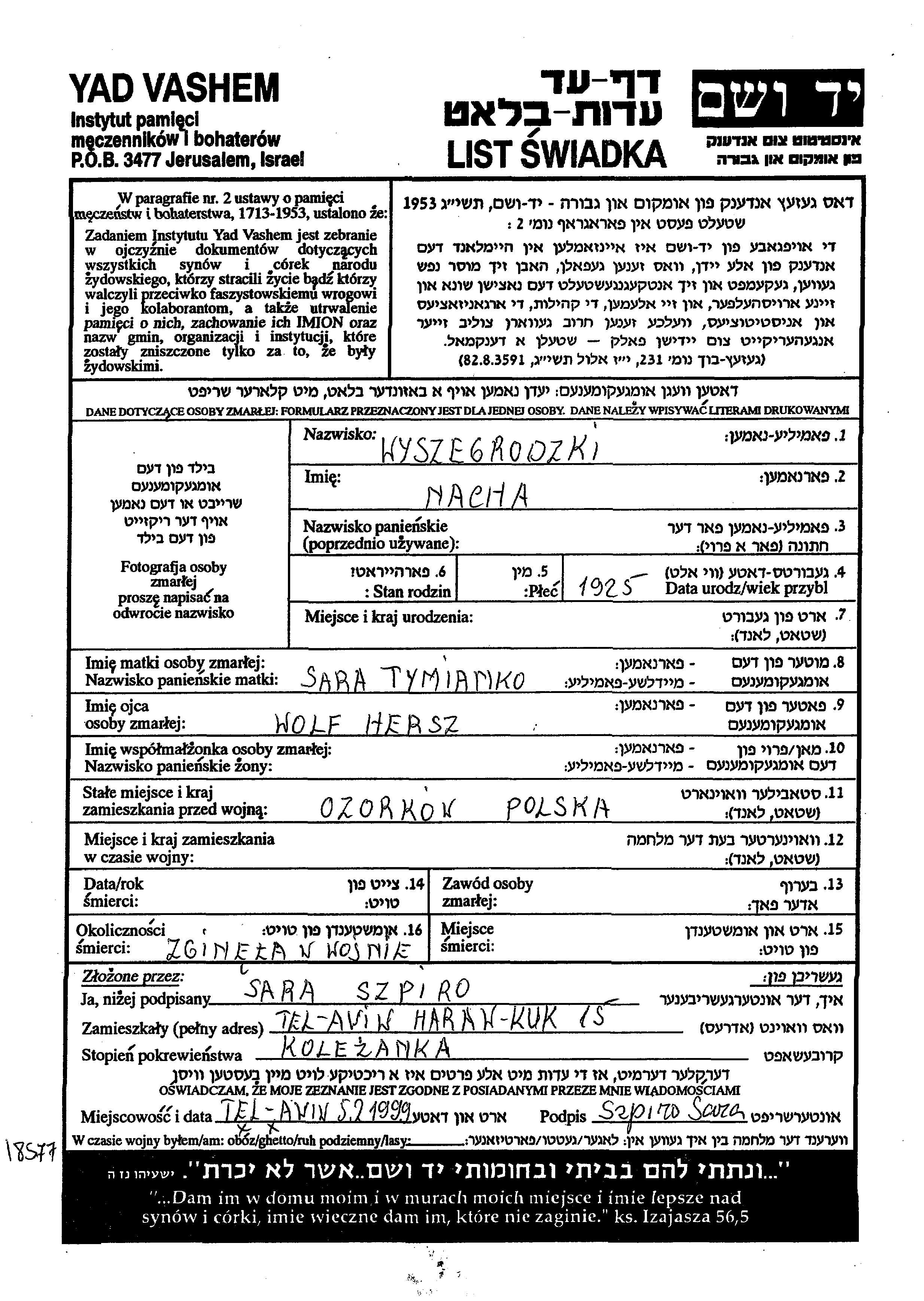 Nacha Wyszegrocka נולדה בOzorkow שבפולין בשנת 1925. לפני מלחמת העולם השניה התגוררה בOzorkow שבפולין.