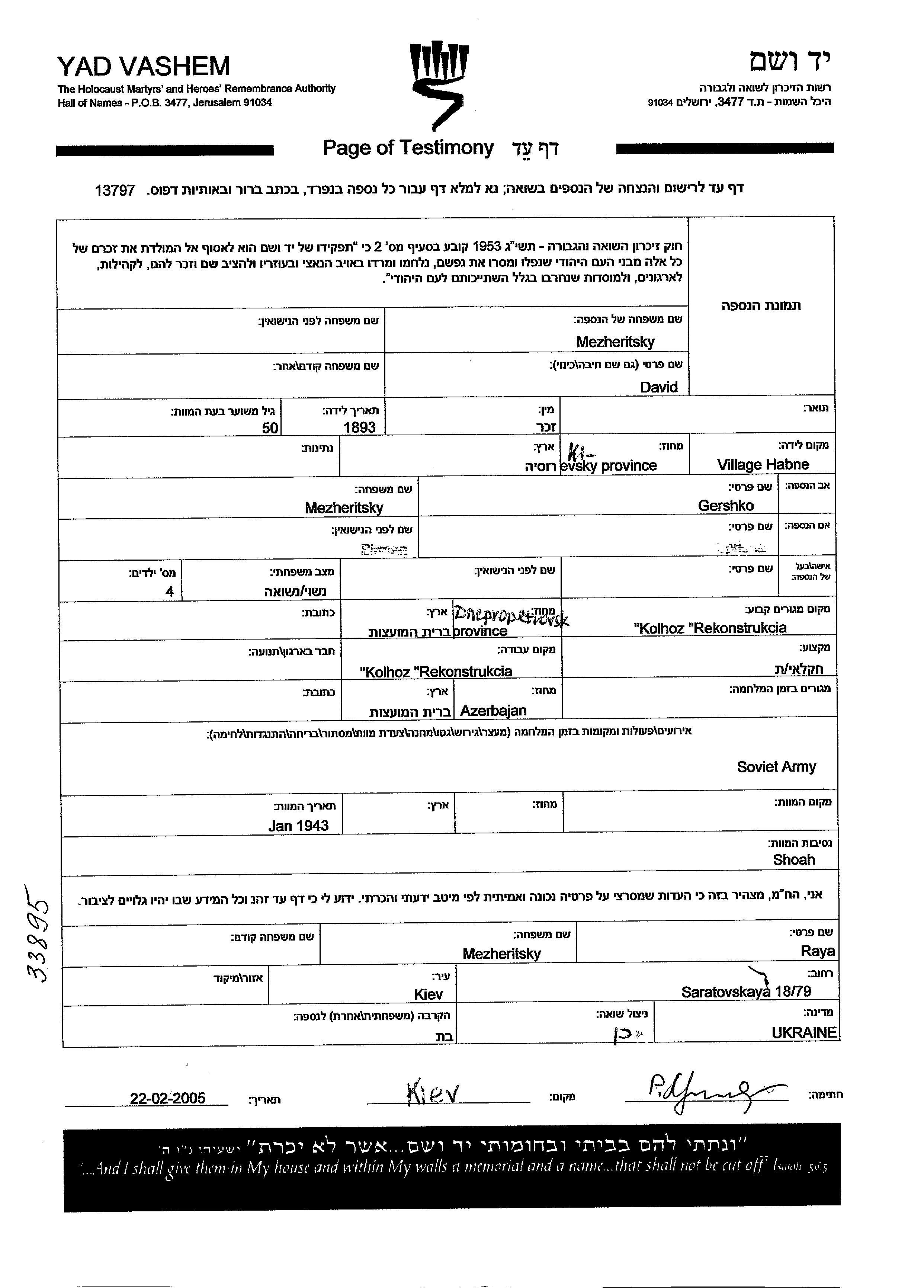 דוד Mezheritsky נולד בKhabne שבאוקראינה (ברה"מ) בשנת 1893. הוא היה חקלאי. לפני מלחמת העולם השניה התגורר בDnepropetrovsk שבאוקראינה (ברה"מ).