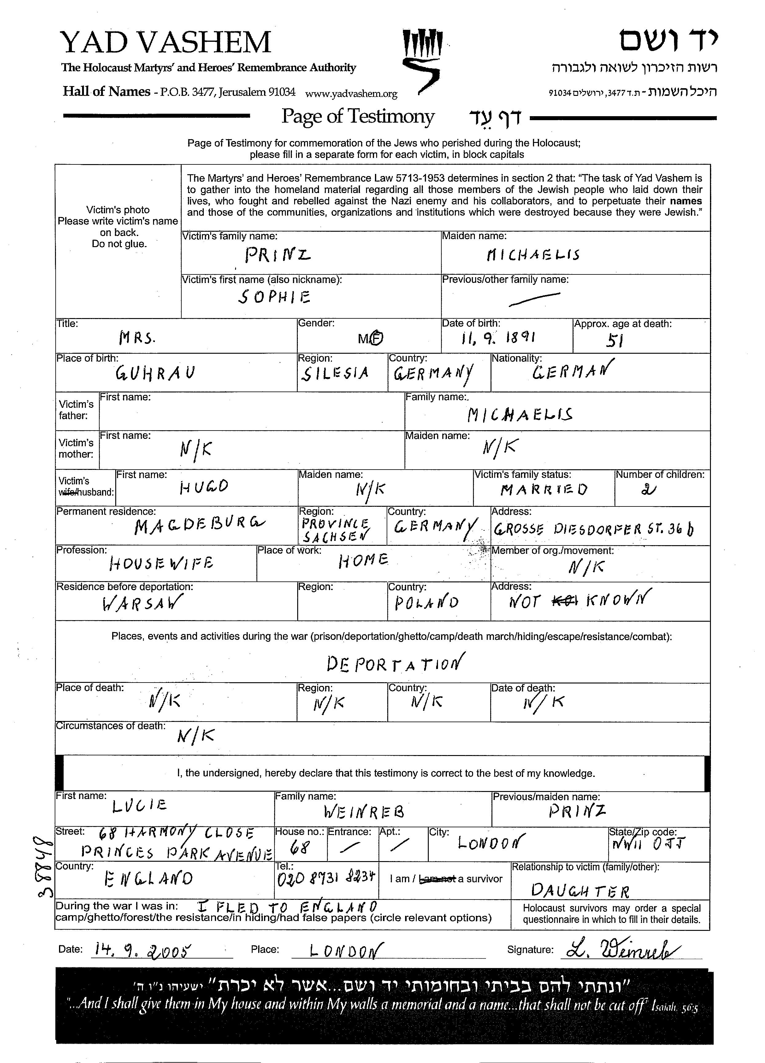 Sofie S Prinz לבית Michaelis נולדה בGuhrau שבגרמניה בשנת 1891. היא היתה עקרת בית. לפני מלחמת העולם השניה התגוררה בMagdeburg שבגרמניה.