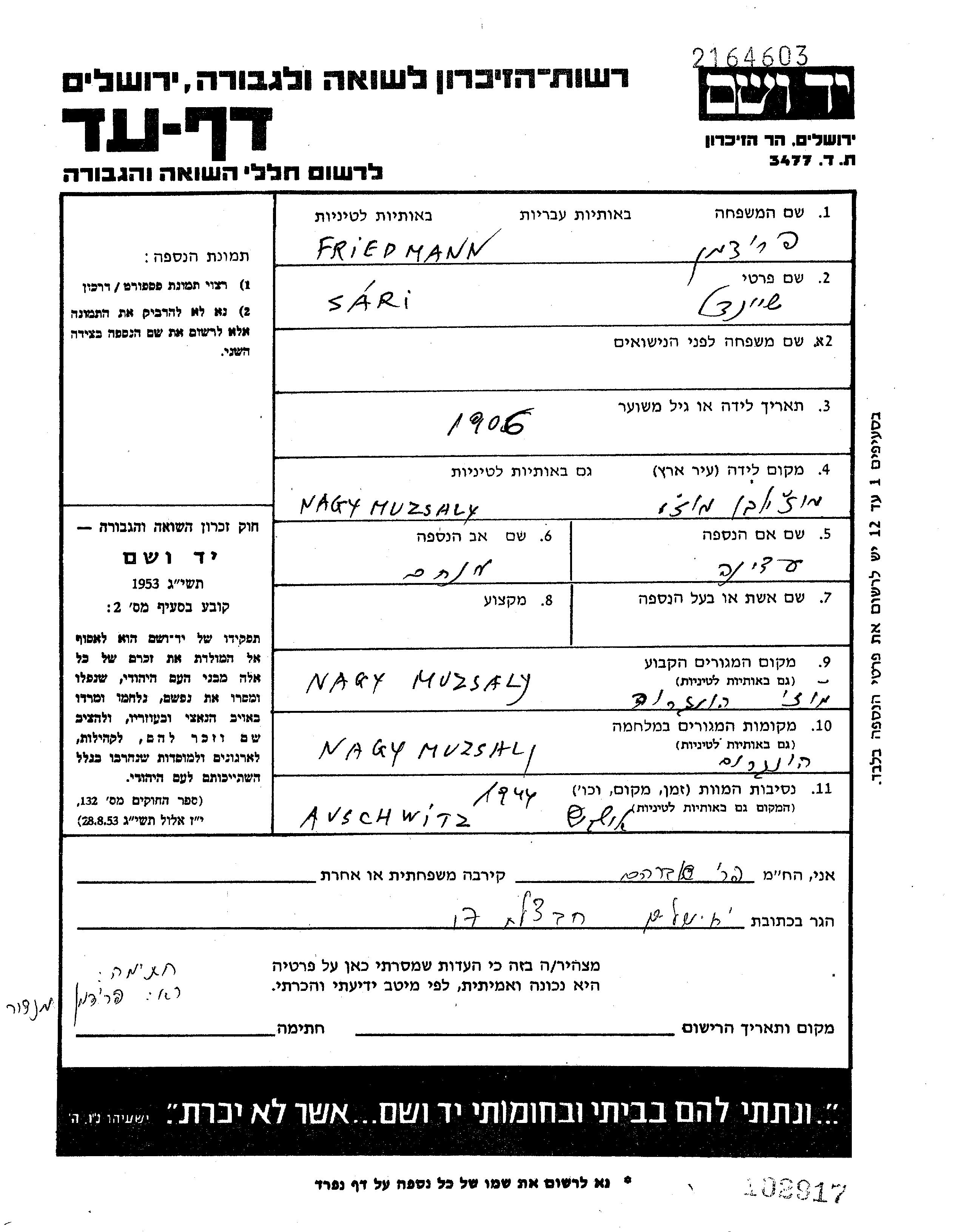 Friedmann | שיינדל Sari | 1906 | Nagymuzsaly, צ'כוסלובקיה | דף-עד |